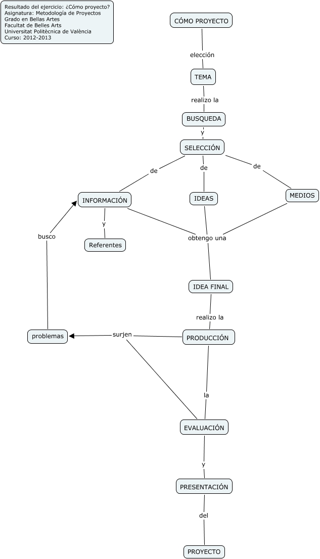 Este Cmap, tiene información relacionada con: FERNANDO MASCARELL.cmap, SELECCIÓN de IDEAS, SELECCIÓN de INFORMACIÓN, SELECCIÓN de MEDIOS, IDEA FINAL realizo la PRODUCCIÓN, INFORMACIÓN y Referentes, EVALUACIÓN y PRESENTACIÓN, PRODUCCIÓN surjen problemas, BUSQUEDA y SELECCIÓN, problemas busco INFORMACIÓN, TEMA realizo la BUSQUEDA, PRESENTACIÓN del PROYECTO, MEDIOS obtengo una IDEA FINAL, EVALUACIÓN surjen problemas, PRODUCCIÓN la EVALUACIÓN, INFORMACIÓN obtengo una IDEA FINAL, IDEAS obtengo una IDEA FINAL, CÓMO PROYECTO elección TEMA