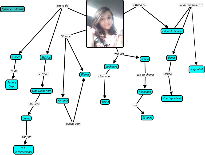 Esse mapa conceitual, produzido no IHMC CmapTools, tem a informação relacionada a: Juliana Corbacho N°16, One Directiom são uma banda, Juliana filha de Antonio, Música é fã da One Directiom, Eduardo Gomes onde também faz dança, Eduardo Gomes onde também faz Espanhol, Juliana tem um irmão, irmão que se chama Fernando, banda cantam POP internacional, Juliana estuda no Eduardo Gomes, dança sendo Comteporânea, filmes fã do Johnny Depp, Juliana gosta de Música, Juliana gosta de filmes, Juliana tem um cachorro, Antonio casado com Elaine, cachorro chamado Boris, Juliana filha de Elaine, Fernando tem 13 anos