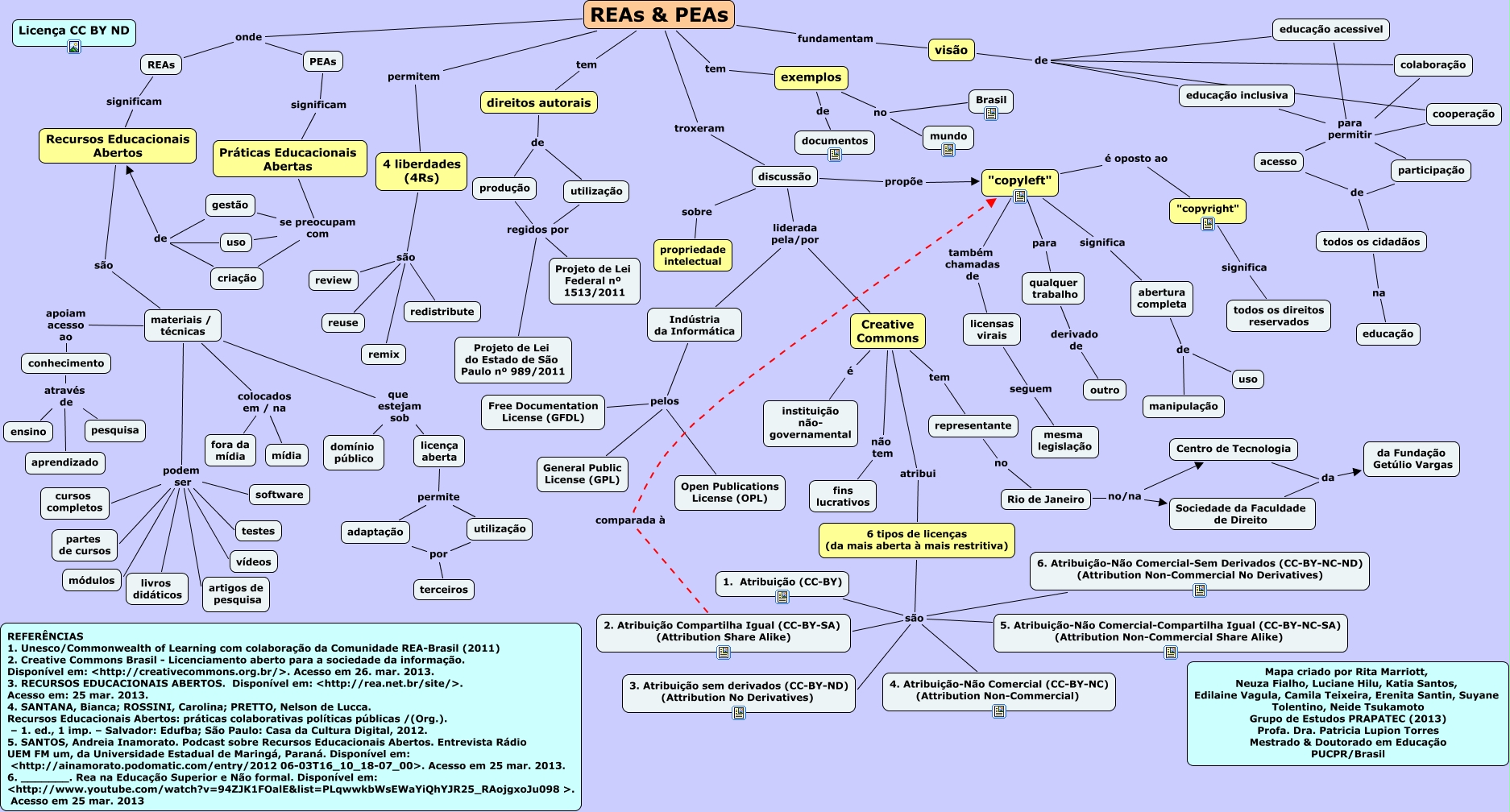 Esse mapa conceitual, produzido no IHMC CmapTools, tem a informação relacionada a: REAs & PEAs, discussão liderada pela/por Indústria da Informática, REAs & PEAs fundamentam visão, educação inclusiva para permitir acesso, "copyleft" para qualquer trabalho, qualquer trabalho derivado de outro, criação de Recursos Educacionais Abertos, Creative Commons é instituição não- governamental, Indústria da Informática pelos Open Publications License (OPL), representante no Rio de Janeiro, exemplos no mundo, cooperação para permitir acesso, 6 tipos de licenças (da mais aberta à mais restritiva) são 6. Atribuição-Não Comercial-Sem Derivados (CC-BY-NC-ND) (Attribution Non-Commercial No Derivatives), exemplos no Brasil, Rio de Janeiro no/na Centro de Tecnologia, 6 tipos de licenças (da mais aberta à mais restritiva) são 3. Atribuição sem derivados (CC-BY-ND) (Attribution No Derivatives), materiais / técnicas colocados em / na fora da mídia, 6 tipos de licenças (da mais aberta à mais restritiva) são 5. Atribuição-Não Comercial-Compartilha Igual (CC-BY-NC-SA) (Attribution Non-Commercial Share Alike), Práticas Educacionais Abertas se preocupam com uso, REAs & PEAs troxeram discussão, materiais / técnicas podem ser software