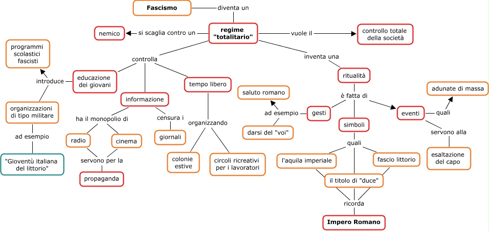 Questa Cmap, creata con IHMC CmapTools, contiene informazioni relative a: 345) Fascismo - Totalitarismo, ritualità è fatta di simboli, gesti ad esempio saluto romano, fascio littorio ricorda Impero Romano, regime "totalitario" si scaglia contro un nemico, il titolo di "duce" ricorda Impero Romano, simboli quali l'aquila imperiale, regime "totalitario" vuole il controllo totale della società, tempo libero organizzando circoli ricreativi per i lavoratori, informazione censura i giornali, informazione ha il monopolio di cinema, eventi quali adunate di massa, informazione ha il monopolio di radio, educazione dei giovani introduce organizzazioni di tipo militare, regime "totalitario" controlla tempo libero, ritualità è fatta di gesti, simboli quali fascio littorio, regime "totalitario" controlla educazione dei giovani, radio servono per la propaganda, regime "totalitario" inventa una ritualità, regime "totalitario" controlla informazione