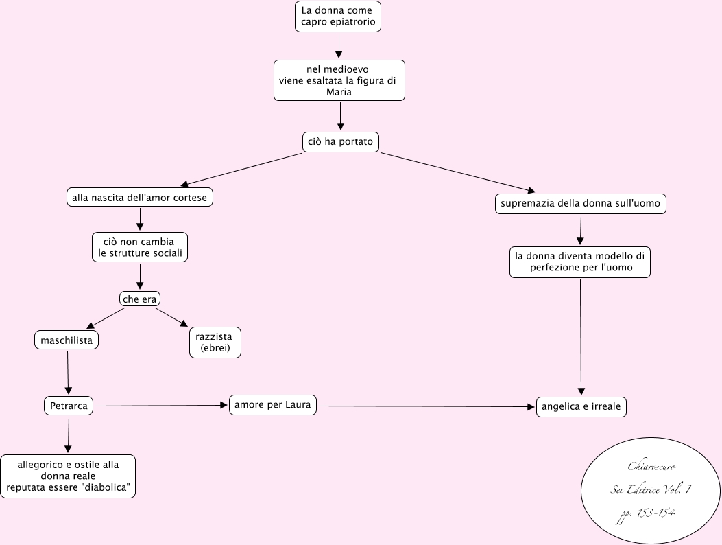 Questa Cmap, creata con IHMC CmapTools, contiene informazioni relative a: donna come capro espiatorio, nel medioevo viene esaltata la figura di Maria ciò ha portato, amore per Laura angelica e irreale, ciò non cambia le strutture sociali che era maschilista, supremazia della donna sull'uomo la donna diventa modello di perfezione per l'uomo, ciò ha portato alla nascita dell'amor cortese, Petrarca allegorico e ostile alla donna reale reputata essere "diabolica", La donna come capro epiatrorio nel medioevo viene esaltata la figura di Maria, ciò non cambia le strutture sociali che era razzista (ebrei), alla nascita dell'amor cortese ciò non cambia le strutture sociali, ciò ha portato supremazia della donna sull'uomo, la donna diventa modello di perfezione per l'uomo angelica e irreale, maschilista Petrarca, Petrarca amore per Laura