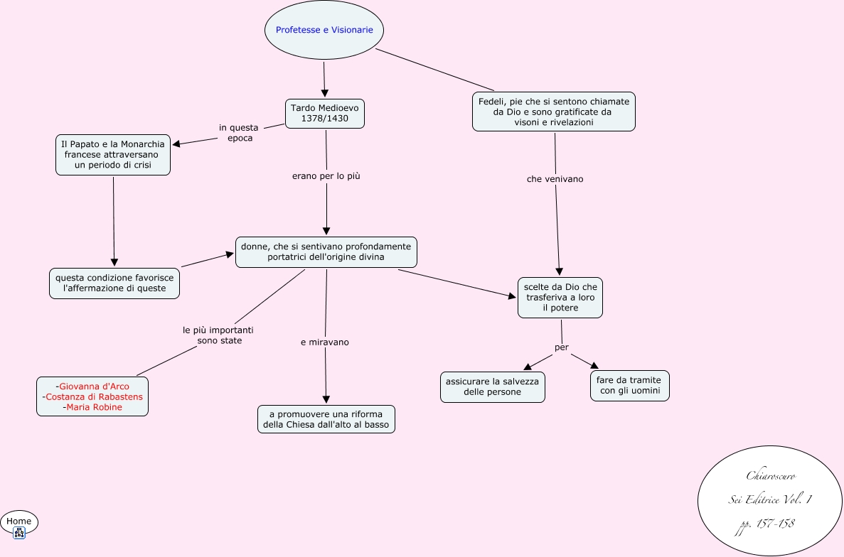 Questa Cmap, creata con IHMC CmapTools, contiene informazioni relative a: PROFETESSE e VISIONARIE, Il Papato e la Monarchia francese attraversano un periodo di crisi questa condizione favorisce l'affermazione di queste, questa condizione favorisce l'affermazione di queste donne, che si sentivano profondamente portatrici dell'origine divina, Tardo Medioevo 1378/1430 in questa epoca Il Papato e la Monarchia francese attraversano un periodo di crisi, donne, che si sentivano profondamente portatrici dell'origine divina le più importanti sono state -Giovanna d'Arco -Costanza di Rabastens -Maria Robine, Tardo Medioevo 1378/1430 erano per lo più donne, che si sentivano profondamente portatrici dell'origine divina, scelte da Dio che trasferiva a loro il potere per assicurare la salvezza delle persone, scelte da Dio che trasferiva a loro il potere per fare da tramite con gli uomini, donne, che si sentivano profondamente portatrici dell'origine divina e miravano a promuovere una riforma della Chiesa dall'alto al basso, Profetesse e Visionarie Fedeli, pie che si sentono chiamate da Dio e sono gratificate da visoni e rivelazioni, Fedeli, pie che si sentono chiamate da Dio e sono gratificate da visoni e rivelazioni che venivano scelte da Dio che trasferiva a loro il potere, Profetesse e Visionarie Tardo Medioevo 1378/1430, donne, che si sentivano profondamente portatrici dell'origine divina scelte da Dio che trasferiva a loro il potere