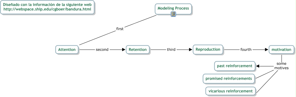 Este Cmap, tiene información relacionada con: modeling Process_ Bandura, Reproduction fourth motivation, Retention third Reproduction, motivation some motives past reinforcement, Modeling Process first Attention, motivation some motives promised reinforcements, Attention second Retention, motivation some motives vicarious reinforcement