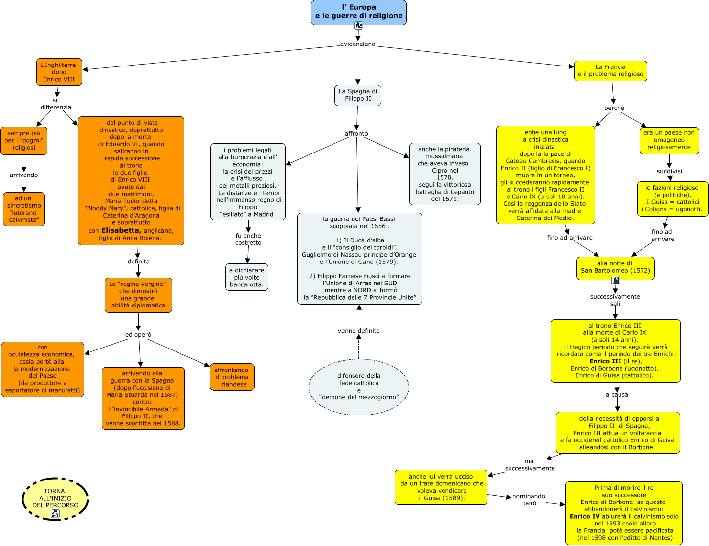 Questa Cmap, creata con IHMC CmapTools, contiene informazioni relative a: elisabetta Filippo e i tre Enrichi, difensore della fede cattolica e “demone del mezzogiorno” venne definito la guerra dei Paesi Bassi scoppiata nel 1556 . 1) Il Duca d’alba e il “consiglio dei torbidi”. Guglielmo di Nassau principe d’Orange e l’Unione di Gand (1579). 2) Filippo Farnese riuscì a formare l’Unione di Arras nel SUD mentre a NORD si formò la “Repubblica delle 7 Provincie Unite”, La “regina vergine” che dimostrò una grande abilità diplomatica ed operò con oculatezza economica, ossia portò alla la modernizzazione del Paese (da produttore a esportatore di manufatti), l' Europa e le guerre di religione evidenziano La Spagna di Filippo II, era un paese non omogeneo religiosamente suddivisi le fazioni religiose (e politiche). I Guisa = cattolici i Coligny = ugonotti., della necessità di opporsi a Filippo II di Spagna, Enrico III attua un voltafaccia e fa uccidereil cattolico Enrico di Guisa alleandosi con il Borbone. ma successivamente anche lui verrà ucciso da un frate domenicano che voleva vendicare il Guisa (1589)., le fazioni religiose (e politiche). I Guisa = cattolici i Coligny = ugonotti. fino ad arrivare alla notte di San Bartolomeo (1572), ebbe una lung a crisi dinastica iniziata dopo la la pace di Cateau Cambresis, quando Enrico II (figlio di Francesco I) muore in un torneo, gli succederanno rapidamente al trono i figli Francesco II e Carlo IX (a soli 10 anni). Così la reggenza dello Stato verrà affidata alla madre Caterina dei Medici. fino ad arrivare alla notte di San Bartolomeo (1572), L'Inghilterra dopo Enrico VIII si differenzia dal punto di vista dinastico, doprattutto dopo la morte di Eduardo VI, quando saliranno in rapida successione al trono le due figlie di Enrico VIII avute dai due matrimoni, Maria Tudor detta "Bloody Mary", cattolica, figlia di Caterina d’Aragona e soprattutto con Elisabetta, anglicana, figlia di Anna Bolena., La Francia e il problema religioso perchè era un paese non omogeneo religiosamente, La Spagna di Filippo II affrontò i problemi legati alla burocrazia e all' economia: la crisi dei prezzi e l’afflusso dei metalli preziosi. Le distanze e i tempi nell’immenso regno di Filippo “esiliato” a Madrid, alla notte di San Bartolomeo (1572) successivamente salì al trono Enrico III alla morte di Carlo IX (a soli 14 anni). Il tragico periodo che seguirà verrà ricordato come il periodo dei tre Enrichi: Enrico III (il re), Enrico di Borbone (ugonotto), Enrico di Guisa (cattolico)., La “regina vergine” che dimostrò una grande abilità diplomatica ed operò affrontando il problema irlandese, al trono Enrico III alla morte di Carlo IX (a soli 14 anni). Il tragico periodo che seguirà verrà ricordato come il periodo dei tre Enrichi: Enrico III (il re), Enrico di Borbone (ugonotto), Enrico di Guisa (cattolico). a causa della necessità di opporsi a Filippo II di Spagna, Enrico III attua un voltafaccia e fa uccidereil cattolico Enrico di Guisa alleandosi con il Borbone., l' Europa e le guerre di religione evidenziano L'Inghilterra dopo Enrico VIII, La “regina vergine” che dimostrò una grande abilità diplomatica ed operò arrivando alla guerra con la Spagna (dopo l’uccisione di Maria Stuarda nel 1587) contro l’”invincibile Armada" di Filippo II, che venne sconfitta nel 1588., l' Europa e le guerre di religione evidenziano La Francia e il problema religioso, anche lui verrà ucciso da un frate domenicano che voleva vendicare il Guisa (1589). nominando però Prima di morire il re suo successore Enrico di Borbone se questo abbandonerà il calvinismo: Enrico IV abiurerà il calvinismo solo nel 1593 esolo allora la Francia poté essere pacificata (nel 1598 con l’editto di Nantes), dal punto di vista dinastico, doprattutto dopo la morte di Eduardo VI, quando saliranno in rapida successione al trono le due figlie di Enrico VIII avute dai due matrimoni, Maria Tudor detta "Bloody Mary", cattolica, figlia di Caterina d’Aragona e soprattutto con Elisabetta, anglicana, figlia di Anna Bolena. definita La “regina vergine” che dimostrò una grande abilità diplomatica, La Spagna di Filippo II affrontò la guerra dei Paesi Bassi scoppiata nel 1556 . 1) Il Duca d’alba e il “consiglio dei torbidi”. Guglielmo di Nassau principe d’Orange e l’Unione di Gand (1579). 2) Filippo Farnese riuscì a formare l’Unione di Arras nel SUD mentre a NORD si formò la “Repubblica delle 7 Provincie Unite”, La Spagna di Filippo II affrontò anche la pirateria mussulmana che aveva invaso Cipro nel 1570. seguì la vittoriosa battaglia di Lepanto del 1571.