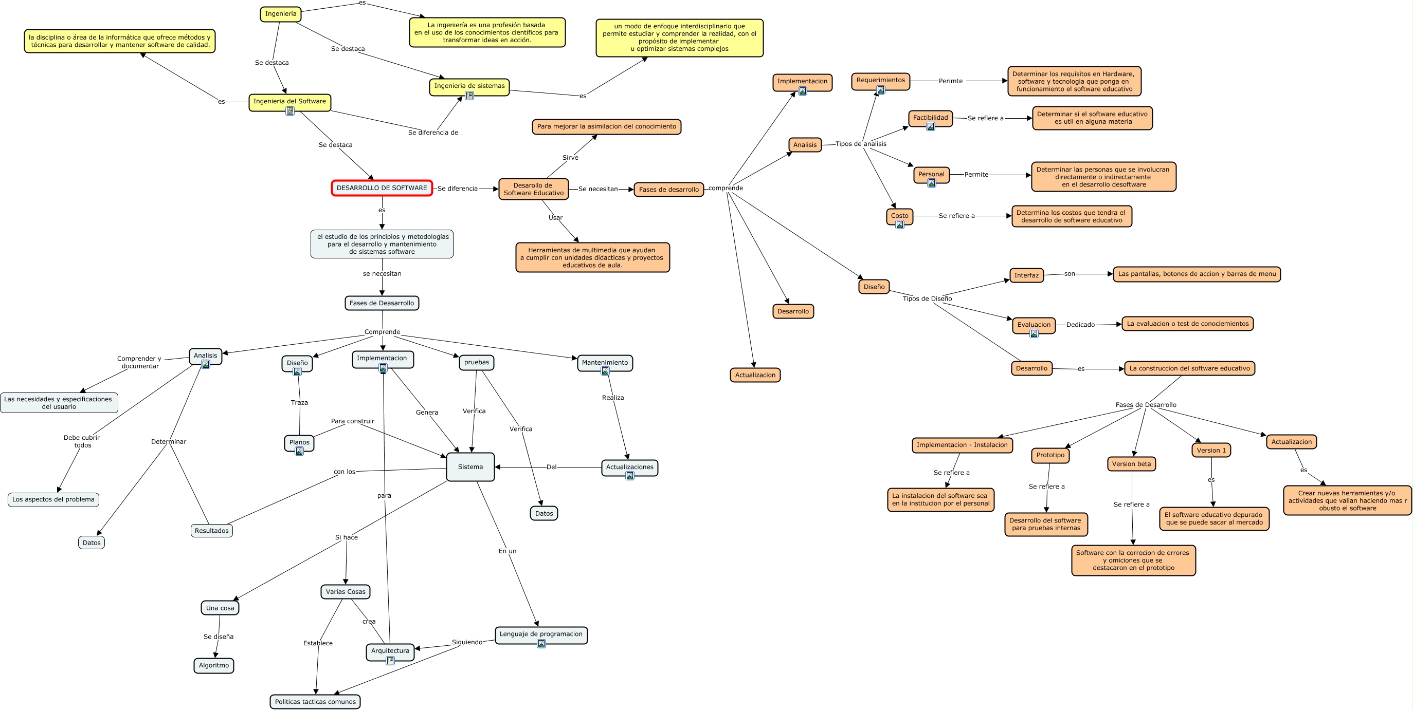 Este Cmap, tiene información relacionada con: Desarrollo de software, pruebas Verifica Sistema, Factibilidad Se refiere a Determinar si el software educativo es util en alguna materia, Ingenieria es La ingeniería es una profesión basada en el uso de los conocimientos científicos para transformar ideas en acción., Implementacion Genera Sistema, Actualizacion es Crear nuevas herramientas y/o actividades que vallan haciendo mas r obusto el software, Prototipo Se refiere a Desarrollo del software para pruebas internas, Diseño Traza Planos, Varias Cosas crea Arquitectura, Desarollo de Software Educativo Se necesitan Fases de desarrollo, Ingenieria de sistemas es un modo de enfoque interdisciplinario que permite estudiar y comprender la realidad, con el propósito de implementar u optimizar sistemas complejos, Analisis Debe cubrir todos Los aspectos del problema, Costo Se refiere a Determina los costos que tendra el desarrollo de software educativo, Diseño Tipos de Diseño Evaluacion, Actualizaciones Del Sistema, Fases de Deasarrollo Comprende Mantenimiento, Fases de desarrollo comprende Implementacion, pruebas Verifica Datos, Version beta Se refiere a Software con la correcion de errores y omiciones que se destacaron en el prototipo, Fases de Deasarrollo Comprende Analisis, Fases de Deasarrollo Comprende pruebas