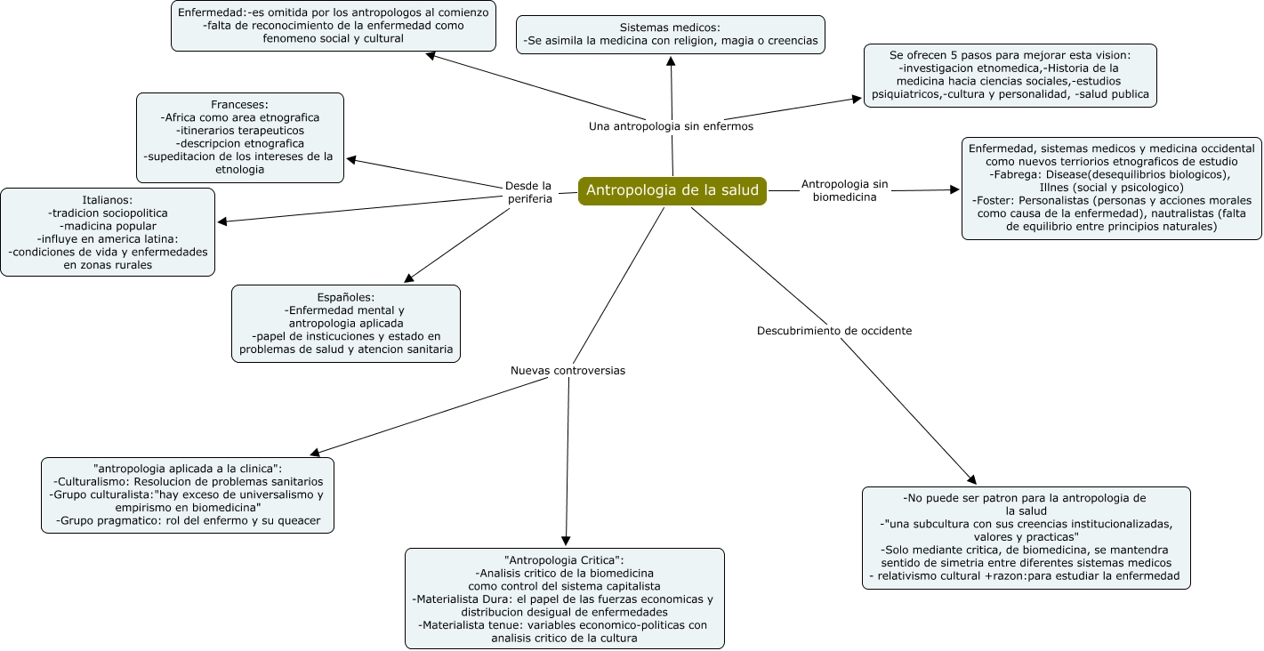 Este Cmap, tiene información relacionada con: Salud, Antropologia de la salud Descubrimiento de occidente -No puede ser patron para la antropologia de la salud -"una subcultura con sus creencias institucionalizadas, valores y practicas" -Solo mediante critica, de biomedicina, se mantendra sentido de simetria entre diferentes sistemas medicos - relativismo cultural +razon:para estudiar la enfermedad, Antropologia de la salud Desde la periferia Italianos: -tradicion sociopolitica -madicina popular -influye en america latina: -condiciones de vida y enfermedades en zonas rurales, Antropologia de la salud Nuevas controversias "antropologia aplicada a la clinica": -Culturalismo: Resolucion de problemas sanitarios -Grupo culturalista:"hay exceso de universalismo y empirismo en biomedicina" -Grupo pragmatico: rol del enfermo y su queacer, Antropologia de la salud Antropologia sin biomedicina Enfermedad, sistemas medicos y medicina occidental como nuevos terriorios etnograficos de estudio -Fabrega: Disease(desequilibrios biologicos), Illnes (social y psicologico) -Foster: Personalistas (personas y acciones morales como causa de la enfermedad), nautralistas (falta de equilibrio entre principios naturales), Antropologia de la salud Nuevas controversias "Antropologia Critica": -Analisis critico de la biomedicina como control del sistema capitalista -Materialista Dura: el papel de las fuerzas economicas y distribucion desigual de enfermedades -Materialista tenue: variables economico-politicas con analisis critico de la cultura, Antropologia de la salud Una antropologia sin enfermos Se ofrecen 5 pasos para mejorar esta vision: -investigacion etnomedica,-Historia de la medicina hacia ciencias sociales,-estudios psiquiatricos,-cultura y personalidad, -salud publica, Antropologia de la salud Desde la periferia Franceses: -Africa como area etnografica -itinerarios terapeuticos -descripcion etnografica -supeditacion de los intereses de la etnologia, Antropologia de la salud Una antropologia sin enfermos Sistemas medicos: -Se asimila la medicina con religion, magia o creencias, Antropologia de la salud Una antropologia sin enfermos Enfermedad:-es omitida por los antropologos al comienzo -falta de reconocimiento de la enfermedad como fenomeno social y cultural, Antropologia de la salud Desde la periferia Españoles: -Enfermedad mental y antropologia aplicada -papel de insticuciones y estado en problemas de salud y atencion sanitaria