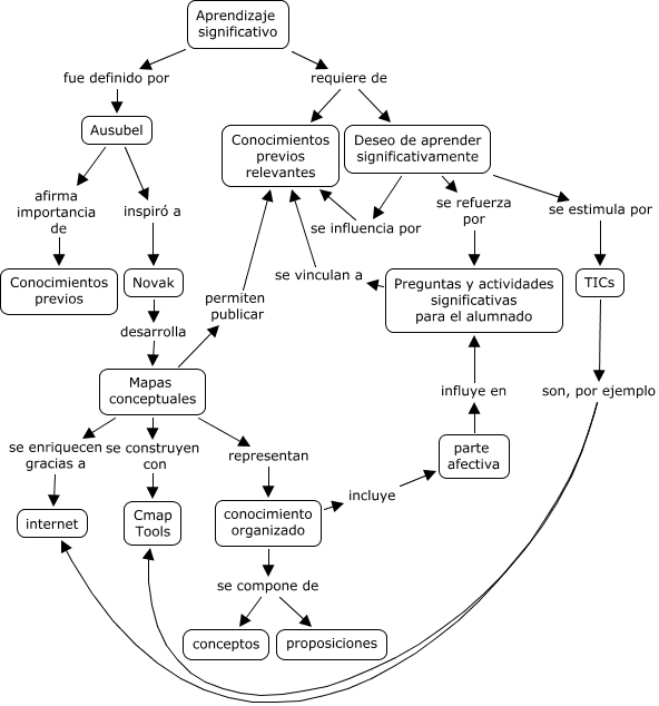 Este Cmap, tiene información relacionada con: aprendizaje significativo, Mapas conceptuales se construyen con Cmap Tools, Aprendizaje significativo requiere de Conocimientos previos relevantes, Deseo de aprender significativamente se estimula por TICs, conocimiento organizado se compone de proposiciones, conocimiento organizado incluye parte afectiva, parte afectiva influye en Preguntas y actividades significativas para el alumnado, Aprendizaje significativo fue definido por Ausubel, Deseo de aprender significativamente se refuerza por Preguntas y actividades significativas para el alumnado, Mapas conceptuales representan conocimiento organizado, Preguntas y actividades significativas para el alumnado se vinculan a Conocimientos previos relevantes, TICs son, por ejemplo internet, TICs son, por ejemplo Cmap Tools, Mapas conceptuales permiten publicar Conocimientos previos relevantes, Aprendizaje significativo requiere de Deseo de aprender significativamente, Ausubel inspiró a Novak, Ausubel afirma importancia de Conocimientos previos, Deseo de aprender significativamente se influencia por Conocimientos previos relevantes, conocimiento organizado se compone de conceptos, Mapas conceptuales se enriquecen gracias a internet, Novak desarrolla Mapas conceptuales