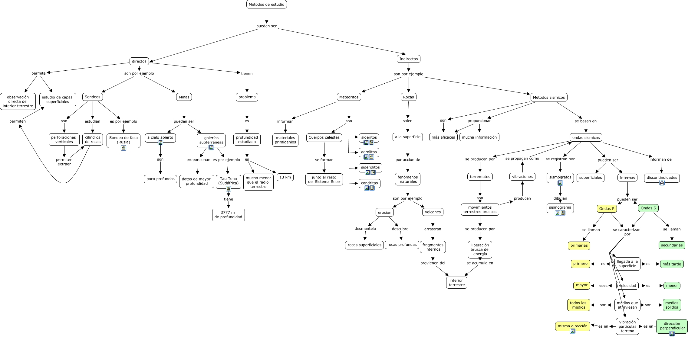 Este Cmap, tiene información relacionada con: Metodos de estudio, fenómenos naturales son por ejemplo volcanes, vibración partículas terreno es en misma dirección, Métodos de estudio pueden ser directos, medios que atraviesan son todos los medios, directos tienen problema, Ondas S se caracterizan por medios que atraviesan, movimientos terrestres bruscos producen vibraciones, Sondeos es por ejemplo Sondeo de Kola (Rusia), terremotos son movimientos terrestres bruscos, directos permite estudio de capas superficiales, Métodos sísmicos proporcionan más eficaces, a cielo abierto son poco profundas, a la superficie por acción de fenómenos naturales, ondas sísmicas pueden ser superficiales, Meteoritos son aerolitos, vibraciones se propagan como ondas sísmicas, cilindros de rocas permiten estudio de capas superficiales, fenómenos naturales son por ejemplo erosión, ondas sísmicas se producen por terremotos, vibración partículas terreno es en dirección perpendicular