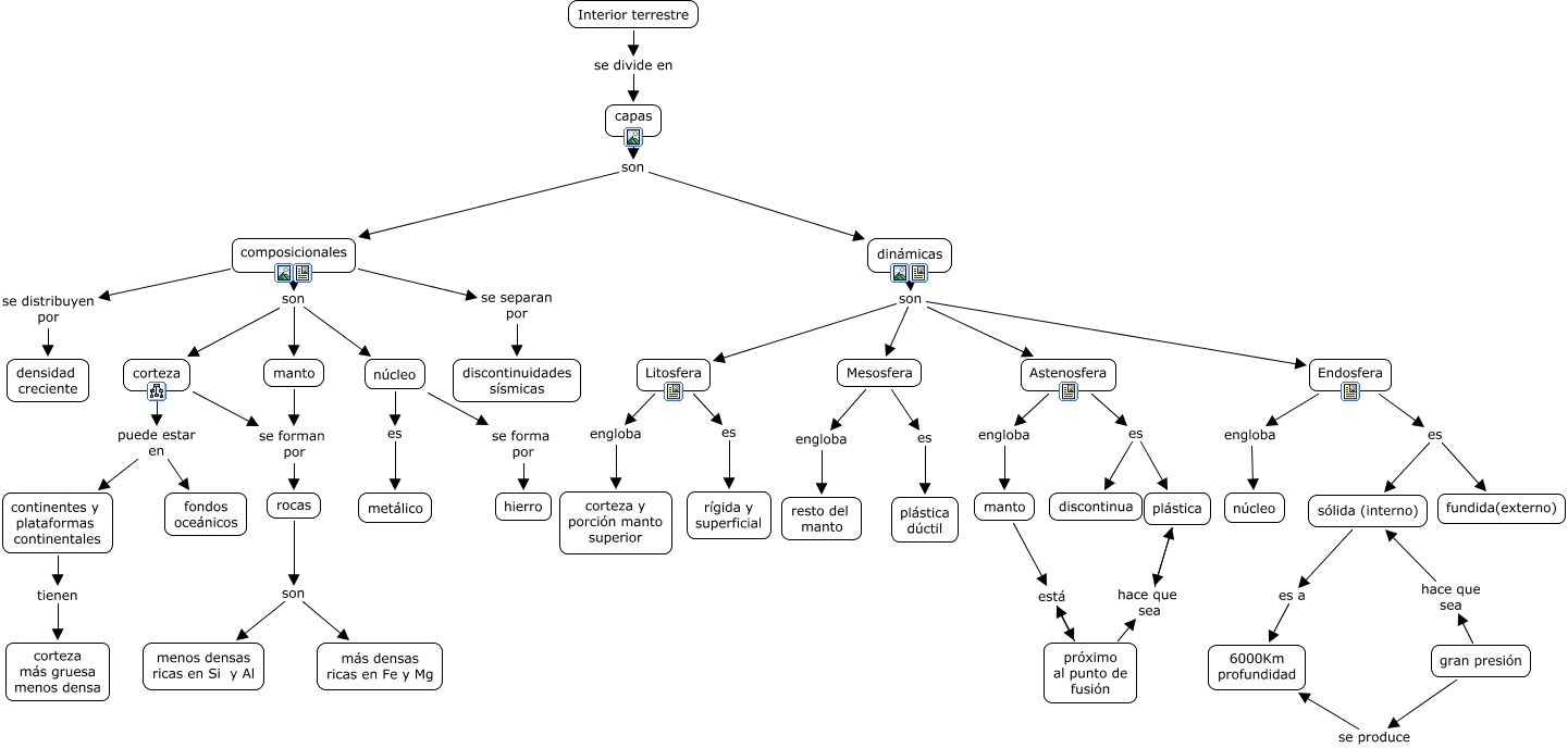 Este Cmap, tiene información relacionada con: capas internas, corteza se forman por rocas, Endosfera es sólida (interno), Mesosfera es plástica dúctil, dinámicas son Mesosfera, Astenosfera es discontinua, capas son dinámicas, dinámicas son Astenosfera, corteza puede estar en continentes y plataformas continentales, continentes y plataformas continentales tienen corteza más gruesa menos densa, gran presión hace que sea sólida (interno), Astenosfera es plástica, capas son composicionales, composicionales son núcleo, composicionales se distribuyen por densidad creciente, gran presión se produce 6000Km profundidad, núcleo es metálico, rocas son más densas ricas en Fe y Mg, próximo al punto de fusión hace que sea plástica, composicionales se separan por discontinuidades sísmicas, núcleo se forma por hierro