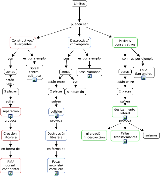 Este Cmap, tiene información relacionada con: Límites, zonas están entre 2 placas, Destructivo/ convergente es por ejemplo Fosa Marianas, Límites pueden ser Pasivos/ conservativos, Pasivos/ conservativos son zonas, Destrucción litosfera en forma de Fosa/ arco isla/ cordillera, colisión provoca Destrucción litosfera, Constructivos/ divergentes son zonas, Creación litosfera en forma de Rift/ dorsal continental, deslizamiento lateral provoca seísmos, zonas están entre 2 placas, 2 placas sufren separación, Límites pueden ser Destructivo/ convergente, Destructivo/ convergente son zonas, Constructivos/ divergentes es por ejemplo Dorsal centro- atlántica, zonas son subducción, deslizamiento lateral provoca Fallas transformantes, 2 placas sufren colisión, deslizamiento lateral provoca ni creación ni destrucción, separación provoca Creación litosfera, Límites pueden ser Constructivos/ divergentes