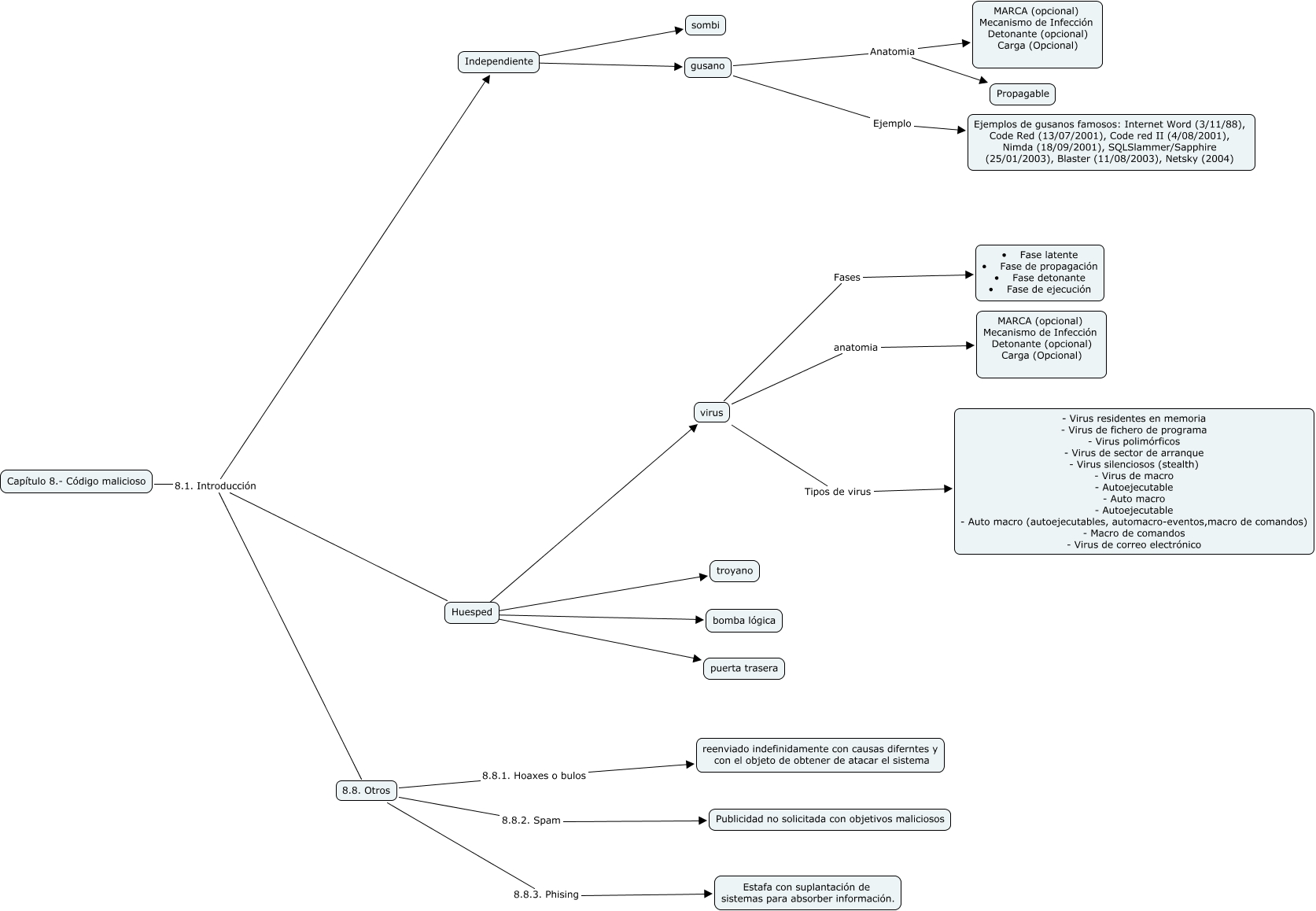 Este Cmap, tiene información relacionada con: 12.8 - Código malicioso, Huesped ???? puerta trasera, virus Fases • Fase latente • Fase de propagación • Fase detonante • Fase de ejecución, 8.8. Otros 8.8.2. Spam Publicidad no solicitada con objetivos maliciosos, gusano Anatomia MARCA (opcional) Mecanismo de Infección Detonante (opcional) Carga (Opcional), virus Tipos de virus - Virus residentes en memoria - Virus de fichero de programa - Virus polimórficos - Virus de sector de arranque - Virus silenciosos (stealth) - Virus de macro - Autoejecutable - Auto macro - Autoejecutable - Auto macro (autoejecutables, automacro-eventos,macro de comandos) - Macro de comandos - Virus de correo electrónico, 8.8. Otros 8.8.3. Phising Estafa con suplantación de sistemas para absorber información., virus anatomia MARCA (opcional) Mecanismo de Infección Detonante (opcional) Carga (Opcional), Capítulo 8.- Código malicioso 8.1. Introducción Independiente, Capítulo 8.- Código malicioso 8.1. Introducción 8.8. Otros, Capítulo 8.- Código malicioso 8.1. Introducción Huesped, Independiente ???? gusano, Independiente ???? sombi, gusano Ejemplo Ejemplos de gusanos famosos: Internet Word (3/11/88), Code Red (13/07/2001), Code red II (4/08/2001), Nimda (18/09/2001), SQLSlammer/Sapphire (25/01/2003), Blaster (11/08/2003), Netsky (2004), Huesped ???? troyano, Huesped ???? bomba lógica, Huesped ???? virus, 8.8. Otros 8.8.1. Hoaxes o bulos reenviado indefinidamente con causas diferntes y con el objeto de obtener de atacar el sistema, gusano Anatomia Propagable