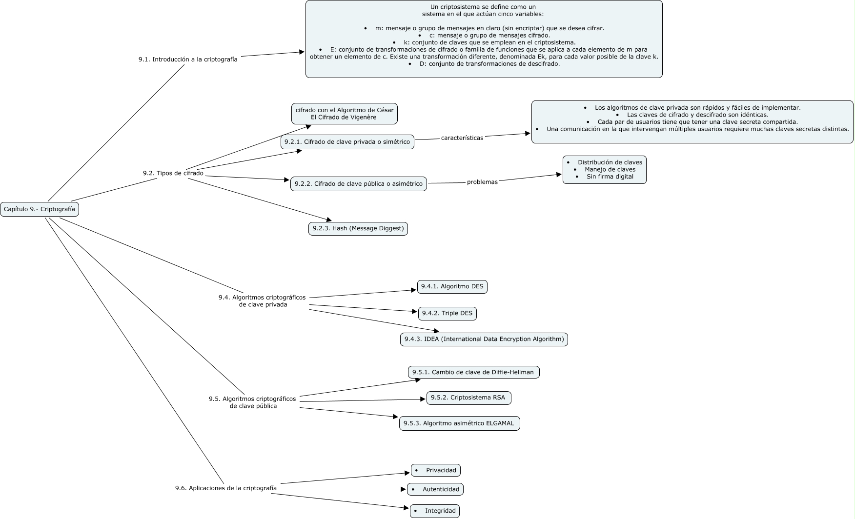 Este Cmap, tiene información relacionada con: 12.9 - Criptografía, Capítulo 9.- Criptografía 9.4. Algoritmos criptográficos de clave privada 9.4.3. IDEA (International Data Encryption Algorithm), Capítulo 9.- Criptografía 9.2. Tipos de cifrado 9.2.1. Cifrado de clave privada o simétrico, Capítulo 9.- Criptografía 9.6. Aplicaciones de la criptografía • Privacidad, Capítulo 9.- Criptografía 9.1. Introducción a la criptografía Un criptosistema se define como un sistema en el que actúan cinco variables: • m: mensaje o grupo de mensajes en claro (sin encriptar) que se desea cifrar. • c: mensaje o grupo de mensajes cifrado. • k: conjunto de claves que se emplean en el criptosistema. • E: conjunto de transformaciones de cifrado o familia de funciones que se aplica a cada elemento de m para obtener un elemento de c. Existe una transformación diferente, denominada Ek, para cada valor posible de la clave k. • D: conjunto de transformaciones de descifrado., 9.2.2. Cifrado de clave pública o asimétrico problemas • Distribución de claves • Manejo de claves • Sin firma digital, Capítulo 9.- Criptografía 9.2. Tipos de cifrado 9.2.3. Hash (Message Diggest), Capítulo 9.- Criptografía 9.6. Aplicaciones de la criptografía • Integridad, 9.2.1. Cifrado de clave privada o simétrico características • Los algoritmos de clave privada son rápidos y fáciles de implementar. • Las claves de cifrado y descifrado son idénticas. • Cada par de usuarios tiene que tener una clave secreta compartida. • Una comunicación en la que intervengan múltiples usuarios requiere muchas claves secretas distintas., Capítulo 9.- Criptografía 9.4. Algoritmos criptográficos de clave privada 9.4.1. Algoritmo DES, Capítulo 9.- Criptografía 9.2. Tipos de cifrado cifrado con el Algoritmo de César El Cifrado de Vigenère, Capítulo 9.- Criptografía 9.6. Aplicaciones de la criptografía • Autenticidad, Capítulo 9.- Criptografía 9.5. Algoritmos criptográficos de clave pública 9.5.2. Criptosistema RSA, Capítulo 9.- Criptografía 9.2. Tipos de cifrado 9.2.2. Cifrado de clave pública o asimétrico, Capítulo 9.- Criptografía 9.5. Algoritmos criptográficos de clave pública 9.5.3. Algoritmo asimétrico ELGAMAL, Capítulo 9.- Criptografía 9.5. Algoritmos criptográficos de clave pública 9.5.1. Cambio de clave de Diffie-Hellman, Capítulo 9.- Criptografía 9.4. Algoritmos criptográficos de clave privada 9.4.2. Triple DES