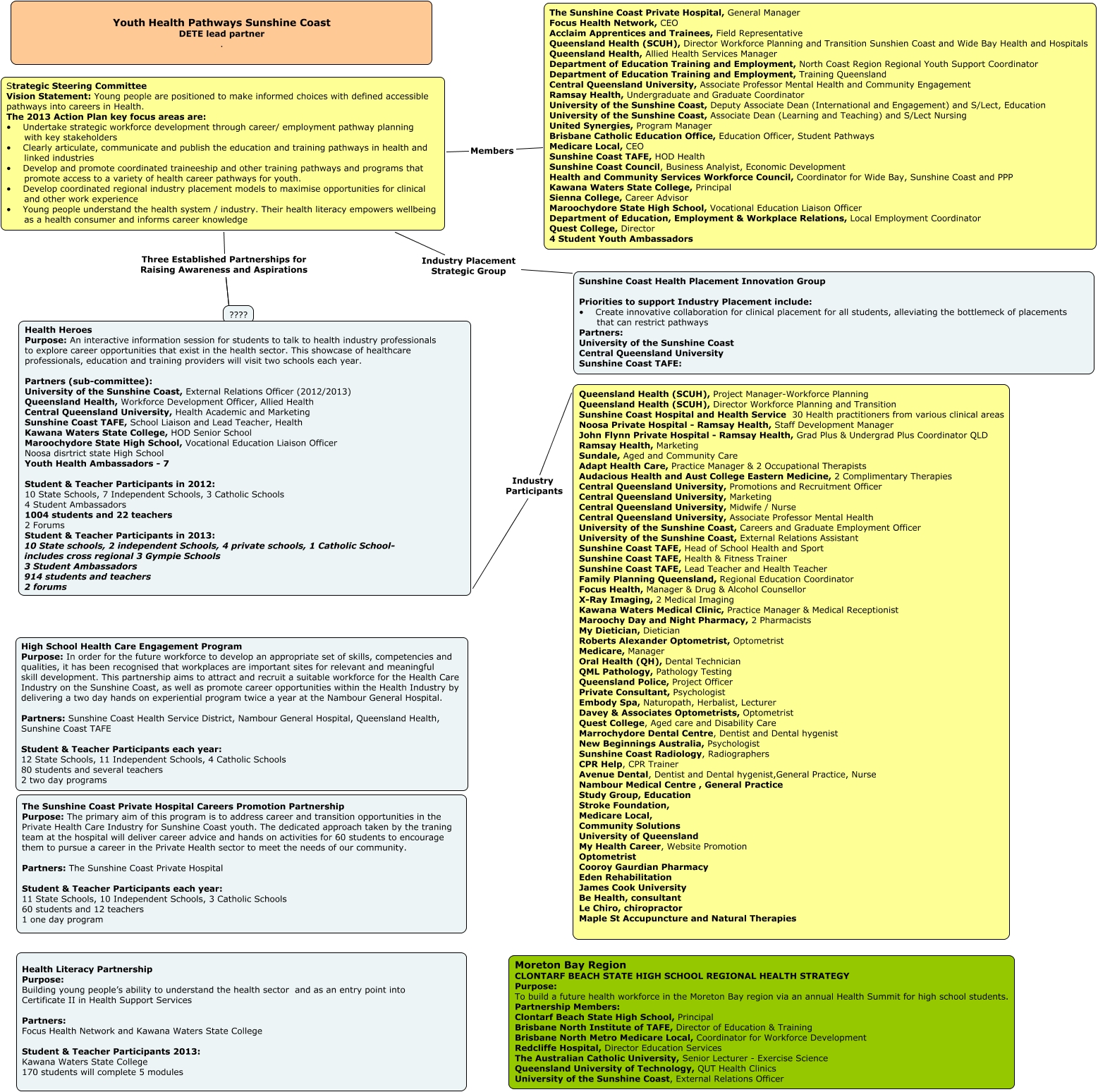 This Concept Map, created with IHMC CmapTools, has information related to: Youth Health Pathways Partnership mapping 2013, Strategic Steering Committee Vision Statement: Young people are positioned to make informed choices with defined accessible pathways into careers in Health. The 2013 Action Plan key focus areas are: • Undertake strategic workforce development through career/ employment pathway planning with key stakeholders • Clearly articulate, communicate and publish the education and training pathways in health and linked industries • Develop and promote coordinated traineeship and other training pathways and programs that promote access to a variety of health career pathways for youth. • Develop coordinated regional industry placement models to maximise opportunities for clinical and other work experience • Young people understand the health system / industry. Their health literacy empowers wellbeing as a health consumer and informs career knowledge Industry Placement Strategic Group Sunshine Coast Health Placement Innovation Group Priorities to support Industry Placement include: • Create innovative collaboration for clinical placement for all students, alleviating the bottlemeck of placements that can restrict pathways Partners: University of the Sunshine Coast Central Queensland University Sunshine Coast TAFE:, Strategic Steering Committee Vision Statement: Young people are positioned to make informed choices with defined accessible pathways into careers in Health. The 2013 Action Plan key focus areas are: • Undertake strategic workforce development through career/ employment pathway planning with key stakeholders • Clearly articulate, communicate and publish the education and training pathways in health and linked industries • Develop and promote coordinated traineeship and other training pathways and programs that promote access to a variety of health career pathways for youth. • Develop coordinated regional industry placement models to maximise opportunities for clinical and other work experience • Young people understand the health system / industry. Their health literacy empowers wellbeing as a health consumer and informs career knowledge Three Established Partnerships for Raising Awareness and Aspirations Health Heroes Purpose: An interactive information session for students to talk to health industry professionals to explore career opportunities that exist in the health sector. This showcase of healthcare professionals, education and training providers will visit two schools each year. Partners (sub-committee): University of the Sunshine Coast, External Relations Officer (2012/2013) Queensland Health, Workforce Development Officer, Allied Health Central Queensland University, Health Academic and Marketing Sunshine Coast TAFE, School Liaison and Lead Teacher, Health Kawana Waters State College, HOD Senior School Maroochydore State High School, Vocational Education Liaison Officer Noosa disrtrict state High School Youth Health Ambassadors - 7 Student & Teacher Participants in 2012: 10 State Schools, 7 Independent Schools, 3 Catholic Schools 4 Student Ambassadors 1004 students and 22 teachers 2 Forums Student & Teacher Participants in 2013: 10 State schools, 2 independent Schools, 4 private schools, 1 Catholic School- includes cross regional 3 Gympie Schools 3 Student Ambassadors 914 students and teachers 2 forums, Strategic Steering Committee Vision Statement: Young people are positioned to make informed choices with defined accessible pathways into careers in Health. The 2013 Action Plan key focus areas are: • Undertake strategic workforce development through career/ employment pathway planning with key stakeholders • Clearly articulate, communicate and publish the education and training pathways in health and linked industries • Develop and promote coordinated traineeship and other training pathways and programs that promote access to a variety of health career pathways for youth. • Develop coordinated regional industry placement models to maximise opportunities for clinical and other work experience • Young people understand the health system / industry. Their health literacy empowers wellbeing as a health consumer and informs career knowledge Members The Sunshine Coast Private Hospital, General Manager Focus Health Network, CEO Acclaim Apprentices and Trainees, Field Representative Queensland Health (SCUH), Director Workforce Planning and Transition Sunshien Coast and Wide Bay Health and Hospitals Queensland Health, Allied Health Services Manager Department of Education Training and Employment, North Coast Region Regional Youth Support Coordinator Department of Education Training and Employment, Training Queensland Central Queensland University, Associate Professor Mental Health and Community Engagement Ramsay Health, Undergraduate and Graduate Coordinator University of the Sunshine Coast, Deputy Associate Dean (International and Engagement) and S/Lect, Education University of the Sunshine Coast, Associate Dean (Learning and Teaching) and S/Lect Nursing United Synergies, Program Manager Brisbane Catholic Education Office, Education Officer, Student Pathways Medicare Local, CEO Sunshine Coast TAFE, HOD Health Sunshine Coast Council, Business Analyist, Economic Development Health and Community Services Workforce Council, Coordinator for Wide Bay, Sunshine Coast and PPP Kawana Waters State College, Principal Sienna College, Career Advisor Maroochydore State High School, Vocational Education Liaison Officer Department of Education, Employment & Workplace Relations, Local Employment Coordinator Quest College, Director 4 Student Youth Ambassadors, Health Heroes Purpose: An interactive information session for students to talk to health industry professionals to explore career opportunities that exist in the health sector. This showcase of healthcare professionals, education and training providers will visit two schools each year. Partners (sub