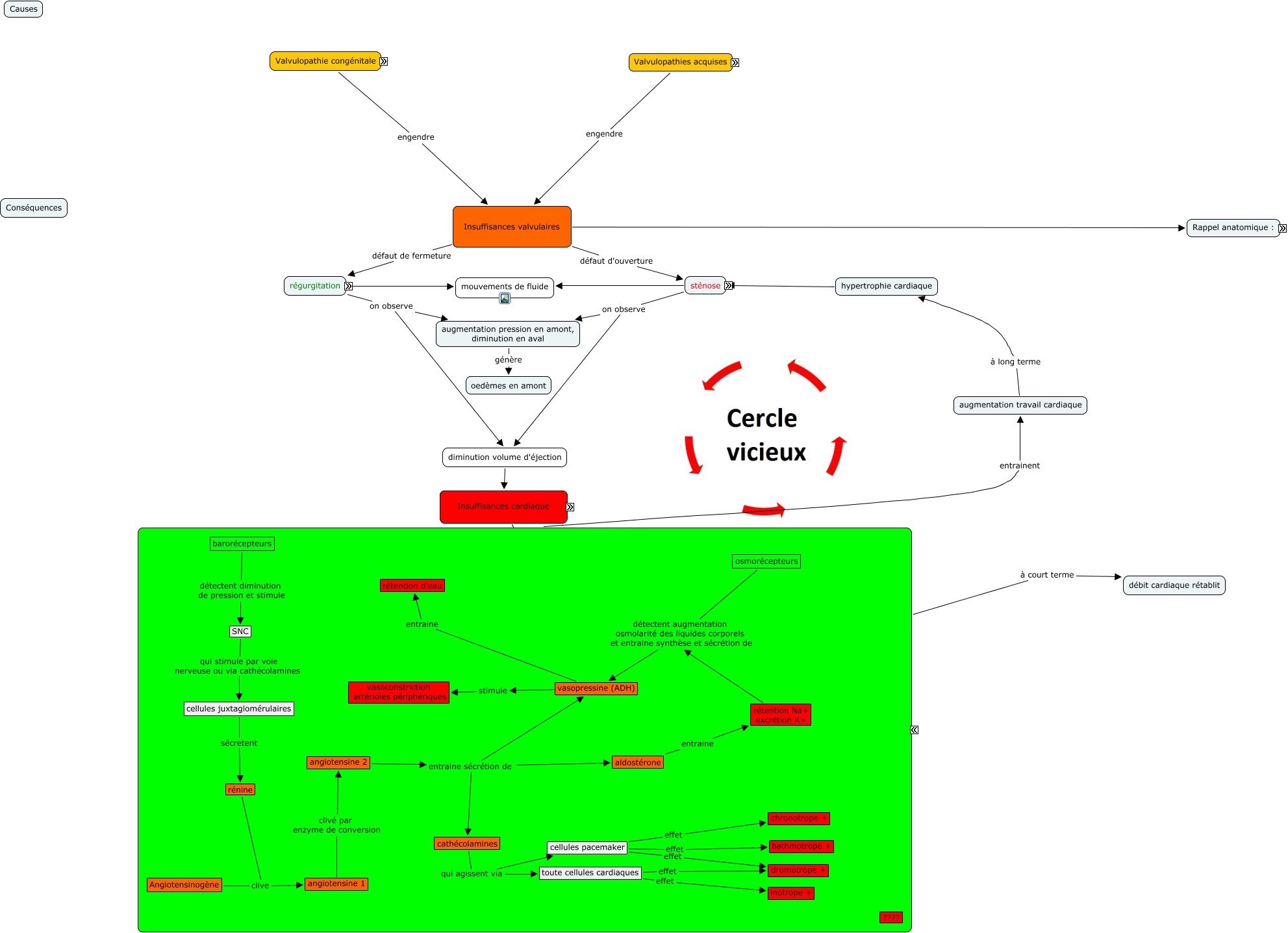 Cette carte de concepts créée avec IHMC CmapTools traite de: Insuffisance valvulaire 3.0, Causes intrinsèques soit alimentation, rétention Na+ excrétion K+ détectent augmentation osmolarité des liquides corporels et entraine synthèse et sécrétion de vasopressine (ADH), angiotensine 1 clivé par enzyme de conversion angiotensine 2, Valve Mitral Ventricule Gauche, augmentation pression OG augmentation pression pulmonaire, angiotensine 2 entraine sécrétion de aldostérone, Causes intrinsèques soit manque d'activité physique, Strucutre du coeur Septum cardiaque, régurgitation mouvements de fluide, cellules pacemaker effet bathmotrope +, Insuffisances cardiaque réponse de l'organisme Mécanismes compensatoires, besoins physiologiques consommation nutriments, besoins physiologiques consommation oxygène, Valve Tricupside Ventricule droit, Rappel Anatomique : Sac pericardique :, Strucutre du coeur Quatre cavités :, Insuffisances valvulaires défaut d'ouverture sténose, Rappel Anatomique : Strucutre du coeur, diminution volume d'éjection Insuffisances cardiaque, augmentation travail VG hypertrophie VG
