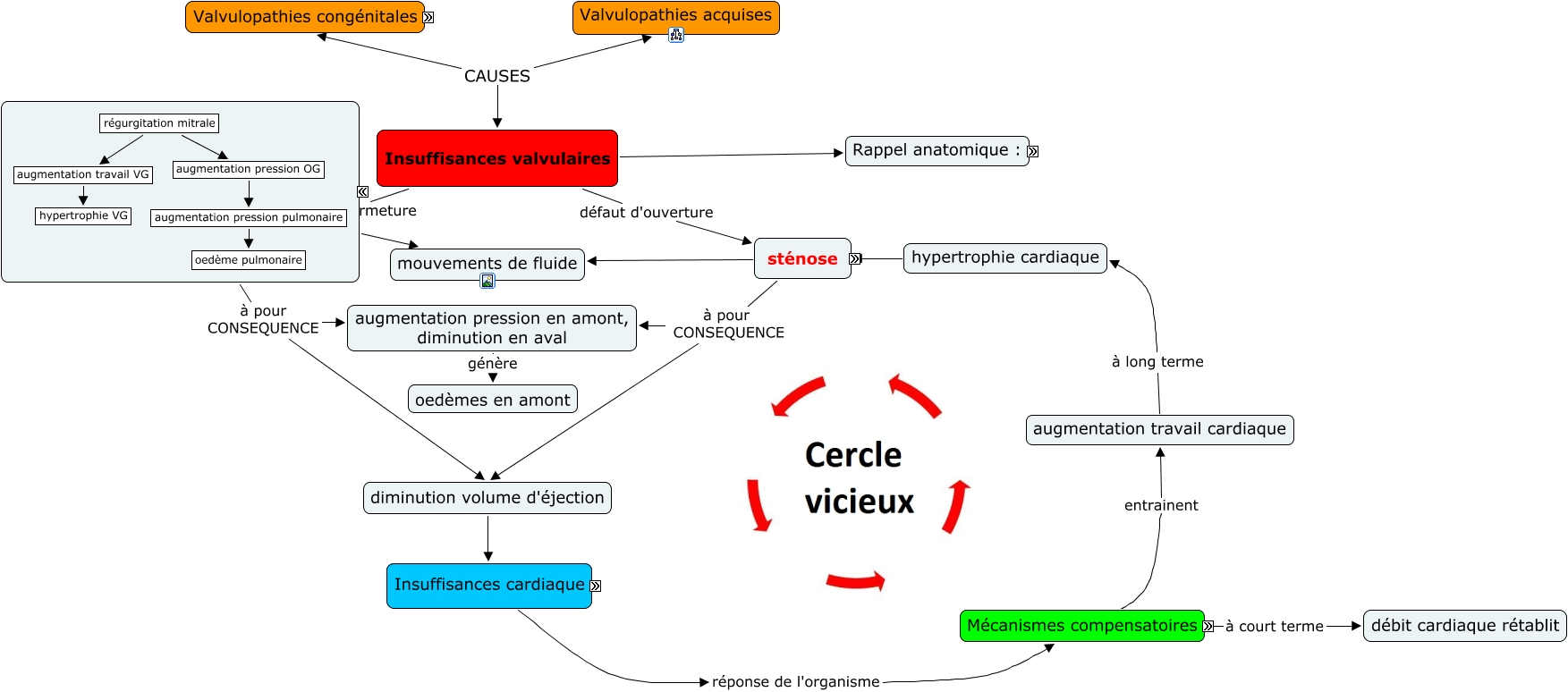 Cette carte de concepts créée avec IHMC CmapTools traite de: insuffisance valvulaire 4.1, Oreillette Gauche Valve Mitral, hypertrophie cardiaque sténose, diminution volume d'éjection Insuffisances cardiaque, Angiotensinogène clive angiotensine 1, bathmotrope + Contrebalance Diminution de pression systémique, cellules pacemaker effet bathmotrope +, rétention d'eau hypervolumie, angiotensine 2 entraine sécrétion de aldostérone, Valve Pulmonaire Petite circulation, Insuffisances valvulaires Rappel anatomique :, Oreillette droite Valve Tricupside, Valve Tricupside Ventricule droit, dilatation de l'OG fibrillation auriculaire, augmentation pression pulmonaire oedème pulmonaire, régurgitation mitrale augmentation travail VG, vasopressine (ADH) entraine rétention d'eau, Valve Mitral Ventricule Gauche, besoins physiologiques consommation oxygène, augmentation travail cardiaque à long terme hypertrophie cardiaque, besoins physiologiques consommation électrolytes