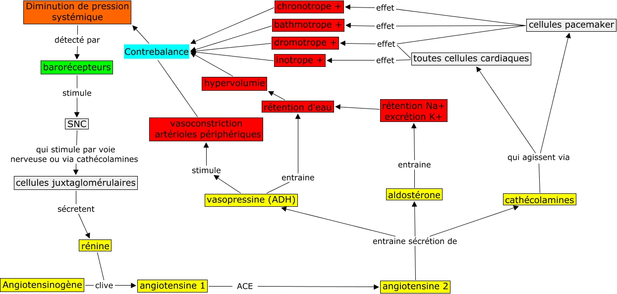 Cette carte de concepts créée avec IHMC CmapTools traite de: mécanismes compensatoires, cellules juxtaglomérulaires sécretent rénine, Diminution de pression systémique détecté par barorécepteurs, vasoconstriction artérioles périphériques Contrebalance Diminution de pression systémique, barorécepteurs stimule SNC, dromotrope + Contrebalance Diminution de pression systémique, aldostérone entraine rétention Na+ excrétion K+, angiotensine 2 entraine sécrétion de aldostérone, vasopressine (ADH) entraine rétention d'eau, chronotrope + Contrebalance Diminution de pression systémique, Angiotensinogène clive angiotensine 1, angiotensine 1 ACE angiotensine 2, inotrope + Contrebalance Diminution de pression systémique, cellules pacemaker effet dromotrope +, cellules pacemaker effet bathmotrope +, rétention d'eau hypervolumie, cathécolamines qui agissent via toutes cellules cardiaques, hypervolumie Contrebalance Diminution de pression systémique, cathécolamines qui agissent via cellules pacemaker, toutes cellules cardiaques effet dromotrope +, toutes cellules cardiaques effet inotrope +