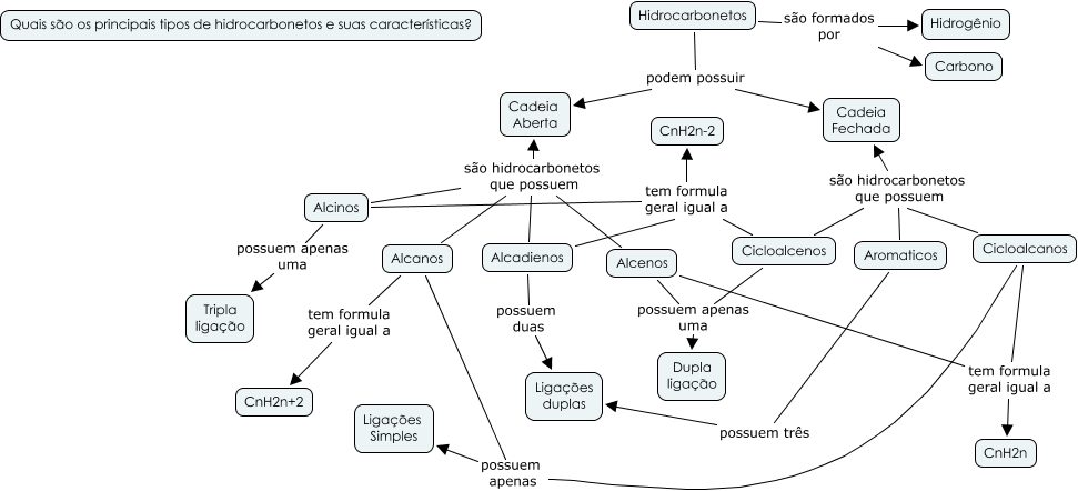 Esse mapa conceitual, produzido no IHMC CmapTools, tem a informação relacionada a: Hidrocarbonetos, Cicloalcanos tem formula geral igual a CnH2n, Alcinos tem formula geral igual a CnH2n-2, Cicloalcanos possuem apenas Ligações Simples, Cicloalcanos são hidrocarbonetos que possuem Cadeia Fechada, Aromaticos são hidrocarbonetos que possuem Cadeia Fechada, Alcanos são hidrocarbonetos que possuem Cadeia Aberta, Hidrocarbonetos podem possuir Cadeia Fechada, Alcadienos tem formula geral igual a CnH2n-2, Hidrocarbonetos são formados por Carbono, Hidrocarbonetos são formados por Hidrogênio, Alcanos tem formula geral igual a CnH2n+2, Alcinos possuem apenas uma Tripla ligação, Alcenos possuem apenas uma Dupla ligação, Alcinos são hidrocarbonetos que possuem Cadeia Aberta, Alcadienos são hidrocarbonetos que possuem Cadeia Aberta, Hidrocarbonetos podem possuir Cadeia Aberta, Alcenos tem formula geral igual a CnH2n, Cicloalcenos tem formula geral igual a CnH2n-2, Alcanos possuem apenas Ligações Simples, Aromaticos possuem três Ligações duplas