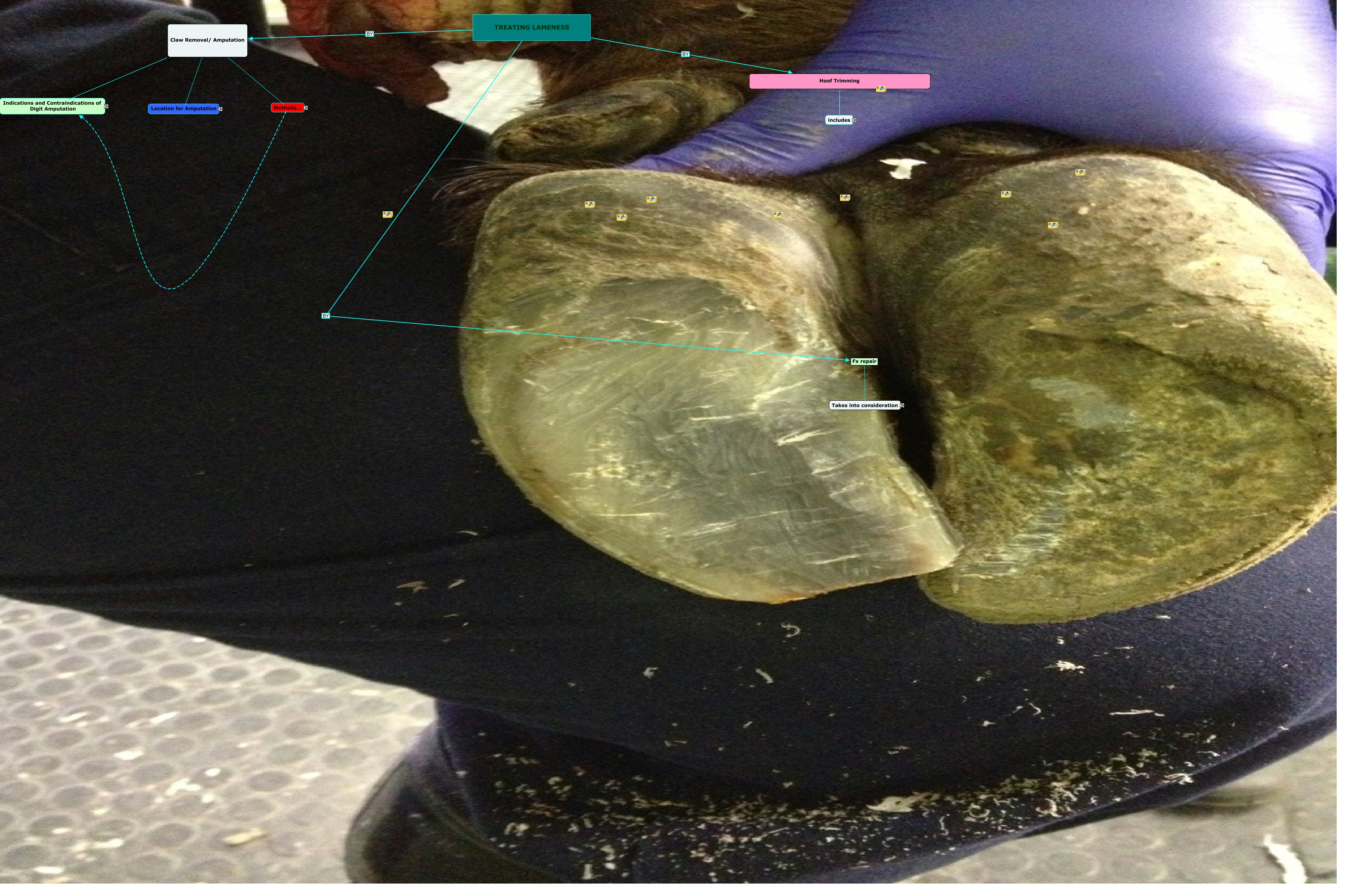 This Concept Map, created with IHMC CmapTools, has information related to: Digit Amputation COMPLETED, Claw Removal/ Amputation Indications for use.... Used to treat: *Pedal osteitis, *Luxation or the fracture of the distal phalanx, * Deep sepsis of the digit, * Septic arthritis of DIP and PIP., Method 1: Gigli Wire Method includes Pre-operative, Method 2: Disarticulation (between P1 and P2) involves Pre- operative Care and Considerations, Intra- operative Procedure 1. Elevate the limb to be operated on and aseptically prepare the area(s) to be worked on., Pre-op considerations comprises Anaesthetic considerations, Fractures based on Methods of closed fixation, Methods of closed fixation such as Robert-Jones bandage with splint, Let the client know the pros and cons, and cost attached to each therapeutic option prior to starting. Client may decide to cull animal instead. Cons * Amputation results in early culling, * Many contraindications, *Persistently poor gait may be seen in cases post op, * Shorter productive life and poor cosmectis results; heavy individuals do poorly; much more difficult for animals to walk on hilly, rocky or slatted floors with amptuated digit. * Better for animals with a short production life or it is coming to an end. (eg. Beef cattle), ADMINISTRATION OF REGIONAL ANAESTHESIA. where IV regional; Place tourniquet proximal to fetlock just before injection when veins are maximally distended. With a 20- gauge needle, 1 1/2 inch needle or a 21- G butterfly catheter, inject 10- 20ml of anaesthetic as close as possible to the surgical site. Tourniquet can be left on for 1 hr., Remove deep flexor tendon of surgical side proximally, especially if pustular discharge is seen at disarticulation site. Deep Digital Flexor Tenotomy 2. Locate deep flexor tendon by cutting through tendon sheath. Pull the correct tendon out and transect the tendon at the incision site., Hoof Trimming Before Distance Examination, ADMINISTRATION OF REGIONAL ANAESTHESIA. using 2% Lidocaine WITHOUT Epinephrine, Post- Operative Care and Considerations For The Animal, Remove deep flexor tendon of surgical side proximally, especially if pustular discharge is seen at disarticulation site. Deep Digital Flexor Tenotomy 3. Place drainage tube: Use Brunner needle to pass the tube through the passge of the deep flexor tendon. Once through tie in a knot and suture the incision site using the simple coninuous pattern., Hoof Trimming possible Complications, IV regional; Place tourniquet proximal to fetlock just before injection when veins are maximally distended. With a 20- gauge needle, 1 1/2 inch needle or a 21- G butterfly catheter, inject 10- 20ml of anaesthetic as close as possible to the surgical site. Tourniquet can be left on for 1 hr. in Hindlimb, Principles of Rx such as ID forces causing it, Dutch 5 Step Method steps 2. Make the outer(lateral) claw equally long and the bearing surface equally high as the inner (medial) claw, Restraint via Chemical Restraint, Intra- operative Procedure 6. Remove deep flexor tendon of surgical side proximally, especially if pustular discharge is seen at disarticulation site.