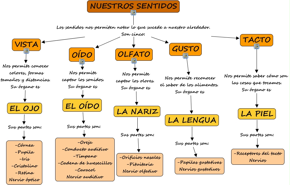 Este Cmap, tiene información relacionada con: SENTIDOS.3ºEP, TACTO Nos permite saber cómo son las cosas que tocamos. Su órgano es LA PIEL, LA LENGUA Sus partes son: -Papilas gustativas Nervios gustativos, EL OÍDO Sus partes son: -Oreja -Conducto auditivo -Tímpano -Cadena de huesecillos -Caracol Nervio auditivo, NUESTROS SENTIDOS Los sentidos nos permiten notar lo que sucede a nuestro alrededor. Son cinco: GUSTO, VISTA Nos permite conocer colores, formas tamaños y distancias. Su órgano es EL OJO, LA PIEL Sus partes son: -Receptores del tacto Nervios, OÍDO Nos permite captar los sonidos. Su órgano es EL OÍDO, NUESTROS SENTIDOS Los sentidos nos permiten notar lo que sucede a nuestro alrededor. Son cinco: TACTO, OLFATO Nos permite captar los olores. Su órgano es LA NARIZ, LA NARIZ Sus partes son: -Orificios nasales -Pituitaria Nervio olfativo, NUESTROS SENTIDOS Los sentidos nos permiten notar lo que sucede a nuestro alrededor. Son cinco: OLFATO, EL OJO Sus partes son: -Córnea -Pupila -Iris -Cristalino -Retina Nervio óptico, NUESTROS SENTIDOS Los sentidos nos permiten notar lo que sucede a nuestro alrededor. Son cinco: VISTA, GUSTO Nos permite reconocer el sabor de los alimentos. Su órgano es LA LENGUA, NUESTROS SENTIDOS Los sentidos nos permiten notar lo que sucede a nuestro alrededor. Son cinco: OÍDO