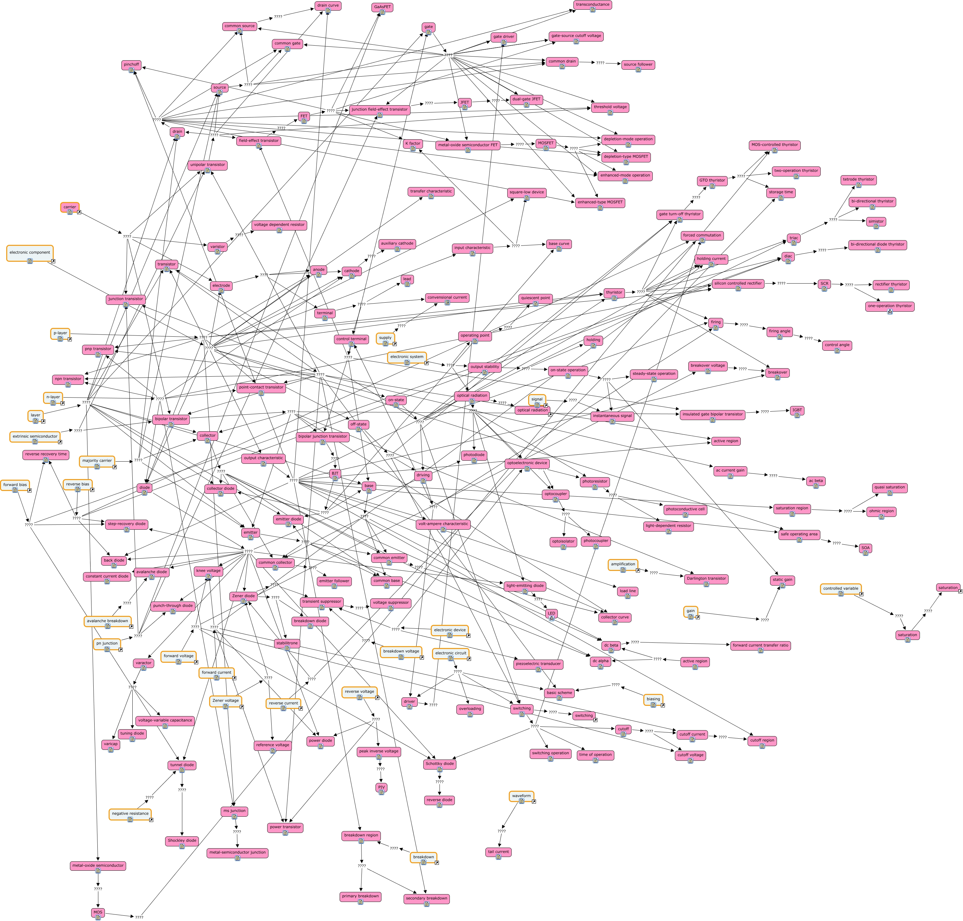 This Concept Map, created with IHMC CmapTools, has information related to: EL ec, electrode ???? cathode, drain ???? enhanced-type MOSFET, on-state ???? driving, SCR ???? one-operation thyristor, firing ???? firing angle, forward voltage ???? cutoff voltage, base ???? common collector, driver ???? gate driver, electronic device ???? optoelectronic device, collector ???? dc alpha, collector ???? common base, GTO thyristor ???? MOS-controlled thyristor, layer ???? source, p-layer ???? thyristor, Zener diode ???? breakdown diode, electronic component ???? on-state, on-state ???? switching, extrinsic semiconductor ???? bipolar transistor, saturation region ???? ohmic region, light-emitting diode ???? LED