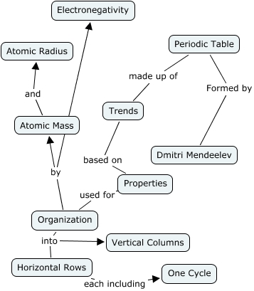 This Concept Map, created with IHMC CmapTools, has information related to: Periodicity, Periodic Table Formed by Dmitri Mendeelev, Trends based on Properties, Properties used for Organization, Organization by Atomic Mass, Organization by Electronegativity, Periodic Table made up of Trends, Organization into Horizontal Rows, Atomic Mass and Atomic Radius, Organization into Vertical Columns, Horizontal Rows each including One Cycle