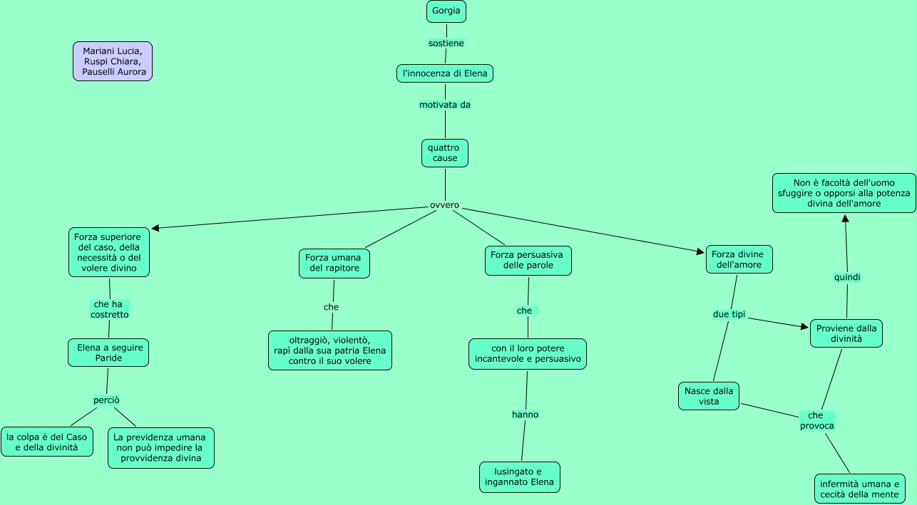 Questa Cmap, creata con IHMC CmapTools, contiene informazioni relative a: Gorgia - Lucia Chiara Aurora, quattro cause ovvero Forza umana del rapitore, Nasce dalla vista che provoca infermità umana e cecità della mente, Forza divine dell'amore due tipi Nasce dalla vista, quattro cause ovvero Forza divine dell'amore, Proviene dalla divinità quindi Non è facoltà dell'uomo sfuggire o opporsi alla potenza divina dell'amore, Forza persuasiva delle parole che con il loro potere incantevole e persuasivo, Forza umana del rapitore che oltraggiò, violentò, rapì dalla sua patria Elena contro il suo volere, Elena a seguire Paride perciò La previdenza umana non può impedire la provvidenza divina, quattro cause ovvero Forza persuasiva delle parole, con il loro potere incantevole e persuasivo hanno lusingato e ingannato Elena, l'innocenza di Elena motivata da quattro cause, Gorgia sostiene l'innocenza di Elena, quattro cause ovvero Forza superiore del caso, della necessità o del volere divino, Forza superiore del caso, della necessità o del volere divino che ha costretto Elena a seguire Paride, Forza divine dell'amore due tipi Proviene dalla divinità, Proviene dalla divinità che provoca infermità umana e cecità della mente, Elena a seguire Paride perciò la colpa è del Caso e della divinità