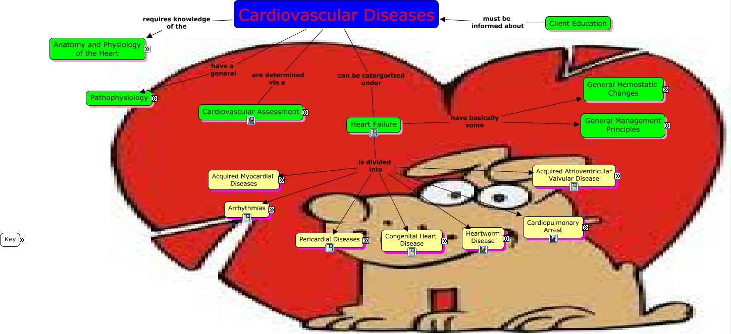 This Concept Map, created with IHMC CmapTools, has information related to: Group 7 - Cardiovascular Diseases, Client Education must be informed about Cardiovascular Diseases, Congenital Heart Disease entails Subaortic Stenosis, Management is divided into Antiarrhythmic Drugs, Acquired Disorders is divided into Pericardial Effusion, Pathophysiology included Arrhythmias, Feline Myocardial Disease is divided into Hypertrophic Cardiomyopathy, Pericardial Disorders entails Congenital/Developmental Disorders, Cardiopulmonary Arrest is divided into Diagnosis, Bradyarrhythmias/ Conduction Disturbances entails Sinus Bradycardia, Cardiac auscultation and evaluation of heart sounds with the aid of an Electrocardiogram, Management is divided into Nutritional Considerations, Bradyarrhythmias/ Conduction Disturbances entails Atrial Standstill, Cardiovascular Assessment essentially comprises of Signalment, Feline Myocardial Disease is divided into Arterial Thromboembolism, Heart Failure is divided into Heartworm Disease, Heart Failure is divided into Acquired Atrioventricular Valvular Disease, Arrhythmias can be divided into Ventricular Arrhythmias, Cardiopulmonary Arrest is divided into Treatment, Acquired Myocardial Disease is divided into Canine Cardiomyopathy, Ventricular Arrhythmias can be divided into Ventricular Fibrillation