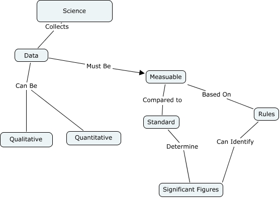 This Concept Map, created with IHMC CmapTools, has information related to: Science, Measuable Compared to Standard, Data Can Be Qualitative, Data Can Be Quantitative, Data Must Be Measuable, Science Collects Data, Rules Can Identify Significant Figures, Measuable Based On Rules, Standard Determine Significant Figures