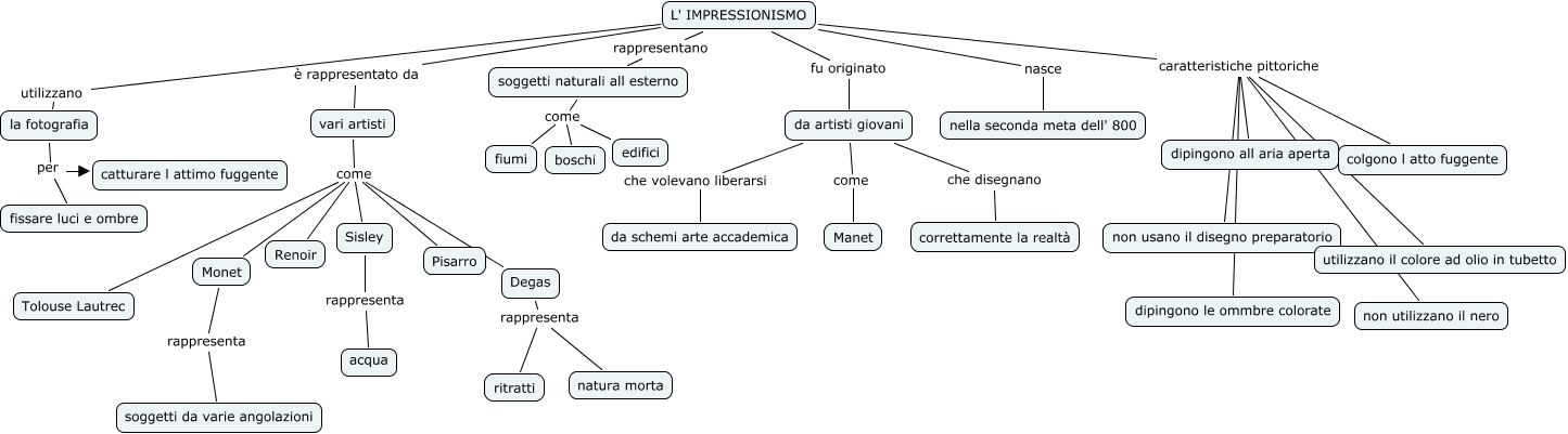 Questa Cmap, creata con IHMC CmapTools, contiene informazioni relative a: IMPRESSIONISMO, L' IMPRESSIONISMO caratteristiche pittoriche colgono l atto fuggente, vari artisti come Monet, Degas rappresenta ritratti, da artisti giovani che volevano liberarsi da schemi arte accademica, L' IMPRESSIONISMO caratteristiche pittoriche non utilizzano il nero, L' IMPRESSIONISMO utilizzano la fotografia, L' IMPRESSIONISMO caratteristiche pittoriche dipingono all aria aperta, vari artisti come Pisarro, vari artisti come Renoir, vari artisti come Sisley, vari artisti come Degas, L' IMPRESSIONISMO caratteristiche pittoriche utilizzano il colore ad olio in tubetto, L' IMPRESSIONISMO fu originato da artisti giovani, L' IMPRESSIONISMO rappresentano soggetti naturali all esterno, la fotografia per fissare luci e ombre, soggetti naturali all esterno come edifici, da artisti giovani come Manet, L' IMPRESSIONISMO caratteristiche pittoriche dipingono le ommbre colorate, Monet rappresenta soggetti da varie angolazioni, L' IMPRESSIONISMO è rappresentato da vari artisti