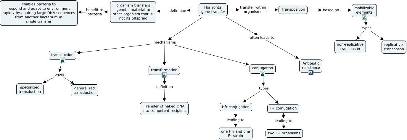 This Concept Map, created with IHMC CmapTools, has information related to: Bacterial Genetics.cmap, Horizontal gene transfer definition organism transfers genetic material to other organism that is not its offspring, F+ conjugation leading to two F+ organisms, Hfr conjugation leading to one Hfr and one F- strain, Horizontal gene transfer often leads to Antibiotic resistance, mobilizable elements types non-replicative transposon, organism transfers genetic material to other organism that is not its offspring benefit to bacteria enables bacteria to respond and adapt to environment rapidly by aquiring large DNA sequences from another bacterium in single transfer, Transposition based on mobilizable elements, Horizontal gene transfer mechanisms transformation, transduction types specialized transduction, transduction types generalized transduction, mobilizable elements types replicative transposon, conjugation types Hfr conjugation, Horizontal gene transfer mechanisms conjugation, conjugation types F+ conjugation, transformation definition Transfer of naked DNA into competent recipient, Horizontal gene transfer mechanisms transduction, Horizontal gene transfer transfer within organisms Transposition