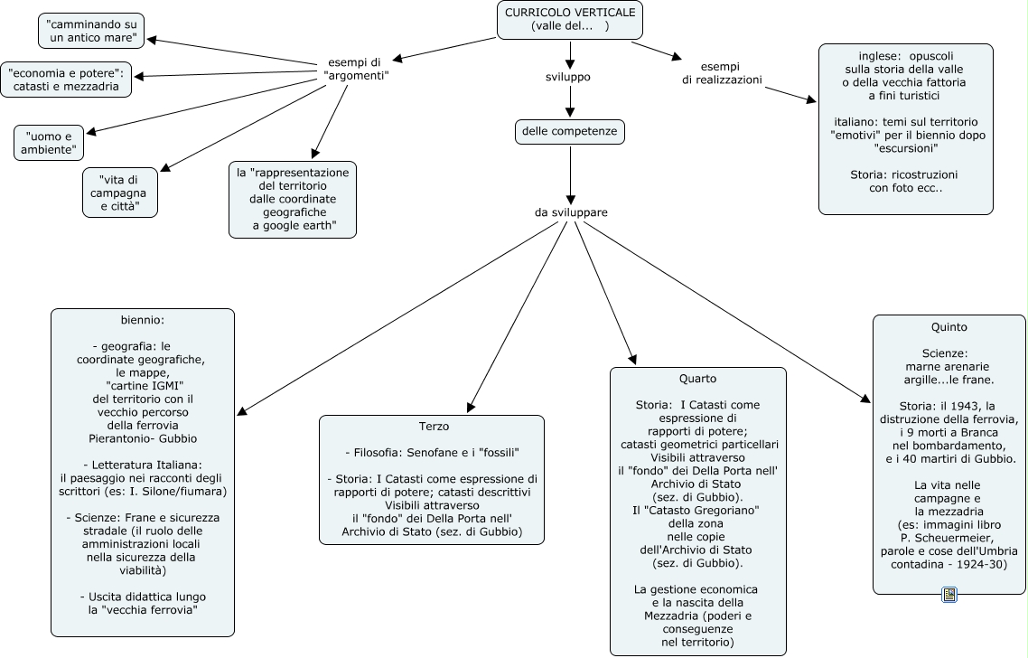 Questa Cmap, creata con IHMC CmapTools, contiene informazioni relative a: rughi, delle competenze da sviluppare biennio: - geografia: le coordinate geografiche, le mappe, "cartine IGMI" del territorio con il vecchio percorso della ferrovia Pierantonio- Gubbio - Letteratura Italiana: il paesaggio nei racconti degli scrittori (es: I. Silone/fiumara) - Scienze: Frane e sicurezza stradale (il ruolo delle amministrazioni locali nella sicurezza della viabilità) - Uscita didattica lungo la "vecchia ferrovia", CURRICOLO VERTICALE (valle del... ) sviluppo delle competenze, CURRICOLO VERTICALE (valle del... ) esempi di "argomenti" "camminando su un antico mare", CURRICOLO VERTICALE (valle del... ) esempi di "argomenti" "vita di campagna e città", delle competenze da sviluppare Quinto Scienze: marne arenarie argille...le frane. Storia: il 1943, la distruzione della ferrovia, i 9 morti a Branca nel bombardamento, e i 40 martiri di Gubbio. La vita nelle campagne e la mezzadria (es: immagini libro P. Scheuermeier, parole e cose dell'Umbria contadina - 1924-30), CURRICOLO VERTICALE (valle del... ) esempi di "argomenti" la "rappresentazione del territorio dalle coordinate geografiche a google earth", CURRICOLO VERTICALE (valle del... ) esempi di realizzazioni inglese: opuscoli sulla storia della valle o della vecchia fattoria a fini turistici italiano: temi sul territorio "emotivi" per il biennio dopo "escursioni" Storia: ricostruzioni con foto ecc.., delle competenze da sviluppare Quarto Storia: I Catasti come espressione di rapporti di potere; catasti geometrici particellari Visibili attraverso il "fondo" dei Della Porta nell' Archivio di Stato (sez. di Gubbio). Il "Catasto Gregoriano" della zona nelle copie dell'Archivio di Stato (sez. di Gubbio). La gestione economica e la nascita della Mezzadria (poderi e conseguenze nel territorio), CURRICOLO VERTICALE (valle del... ) esempi di "argomenti" "uomo e ambiente", delle competenze da sviluppare Terzo - Filosofia: Senofane e i "fossili" - Storia: I Catasti come espressione di rapporti di potere; catasti descrittivi Visibili attraverso il "fondo" dei Della Porta nell' Archivio di Stato (sez. di Gubbio), CURRICOLO VERTICALE (valle del... ) esempi di "argomenti" "economia e potere": catasti e mezzadria