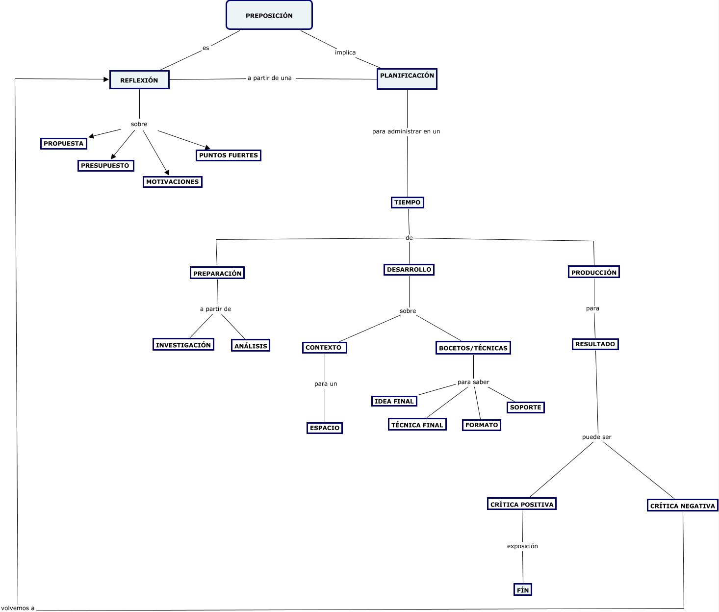 Este Cmap, tiene información relacionada con: Patricia Soto Vásquez, DESARROLLO sobre BOCETOS/TÉCNICAS, REFLEXIÓN sobre PRESUPUESTO, TIEMPO de DESARROLLO, SOPORTE para saber FORMATO, REFLEXIÓN sobre PROPUESTA, PRODUCCIÓN para RESULTADO, CRÍTICA NEGATIVA volvemos a REFLEXIÓN, TÉCNICA FINAL para saber FORMATO, PREPARACIÓN de DESARROLLO, REFLEXIÓN sobre MOTIVACIONES, PREPOSICIÓN implica PLANIFICACIÓN, PREPARACIÓN a partir de ANÁLISIS, CONTEXTO sobre BOCETOS/TÉCNICAS, REFLEXIÓN sobre PUNTOS FUERTES, BOCETOS/TÉCNICAS para saber FORMATO, PLANIFICACIÓN para administrar en un TIEMPO, CONTEXTO para un ESPACIO, CRÍTICA POSITIVA exposición FÍN, RESULTADO puede ser CRÍTICA NEGATIVA, IDEA FINAL para saber FORMATO