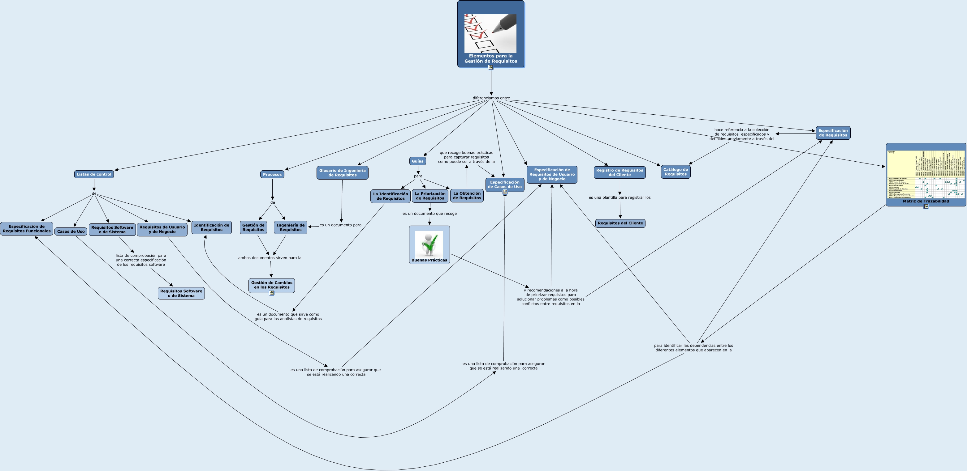 Este Cmap, tiene información relacionada con: Elementos para la Gestión de Requisitos, Glosario de Ingeniería de Requisitos es un documento para Ingeniería de Requisitos, Listas de control de Casos de Uso, Registro de Requisitos del Cliente es una plantilla para registrar los Requisitos del Cliente, Guías para La Identificación de Requisitos, Matriz de Trazabilidad para identificar las dependencias entre los diferentes elementos que aparecen en la Especificación de Requisitos, Elementos para la Gestión de Requisitos diferenciamos entre Guías, Procesos de Ingeniería de Requisitos, Guías para La Priorización de Requisitos, Buenas Prácticas y recomendaciones a la hora de priorizar requisitos para solucionar problemas como posibles conflictos entre requisitos en la Especificación de Requisitos de Usuario y de Negocio, Elementos para la Gestión de Requisitos diferenciamos entre Procesos, Requisitos de Usuario y de Negocio es una lista de comprobación para asegurar que se está realizando una correcta Especificación de Requisitos de Usuario y de Negocio, Elementos para la Gestión de Requisitos diferenciamos entre Listas de control, Elementos para la Gestión de Requisitos diferenciamos entre Especificación de Requisitos, Matriz de Trazabilidad para identificar las dependencias entre los diferentes elementos que aparecen en la Especificación de Requisitos de Usuario y de Negocio, Requisitos Software o de Sistema lista de comprobación para una correcta especificación de los requisitos software Requisitos Software o de Sistema, Elementos para la Gestión de Requisitos diferenciamos entre Catálogo de Requisitos, Guías para La Obtención de Requisitos, Listas de control de Requisitos Software o de Sistema, Elementos para la Gestión de Requisitos diferenciamos entre Especificación de Requisitos de Usuario y de Negocio, Procesos de Gestión de Requisitos