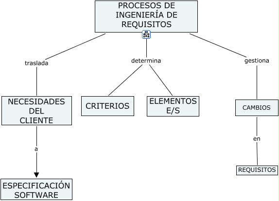 Este Cmap, tiene información relacionada con: Proceso IR, PROCESOS DE INGENIERÍA DE REQUISITOS traslada NECESIDADES DEL CLIENTE, PROCESOS DE INGENIERÍA DE REQUISITOS determina CRITERIOS, CAMBIOS en REQUISITOS, NECESIDADES DEL CLIENTE a ESPECIFICACIÓN SOFTWARE, PROCESOS DE INGENIERÍA DE REQUISITOS gestiona CAMBIOS, PROCESOS DE INGENIERÍA DE REQUISITOS determina ELEMENTOS E/S