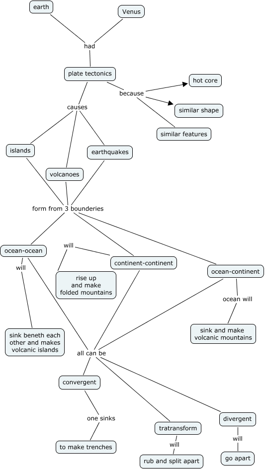 This Concept Map, created with IHMC CmapTools, has information related to: venus, ocean-ocean all can be divergent, Venus had plate tectonics, convergent one sinks to make trenches, volcanoes form from 3 bounderies ocean-ocean, plate tectonics causes volcanoes, plate tectonics causes islands, plate tectonics because similar features, plate tectonics causes earthquakes, ocean-continent all can be convergent, continent-continent all can be divergent, continent-continent all can be tratransform, ocean-continent all can be divergent, islands form from 3 bounderies ocean-ocean, earthquakes form from 3 bounderies ocean-continent, plate tectonics because hot core, continent-continent will rise up and make folded mountains, volcanoes form from 3 bounderies continent-continent, volcanoes form from 3 bounderies ocean-continent, earthquakes form from 3 bounderies ocean-ocean, islands form from 3 bounderies continent-continent