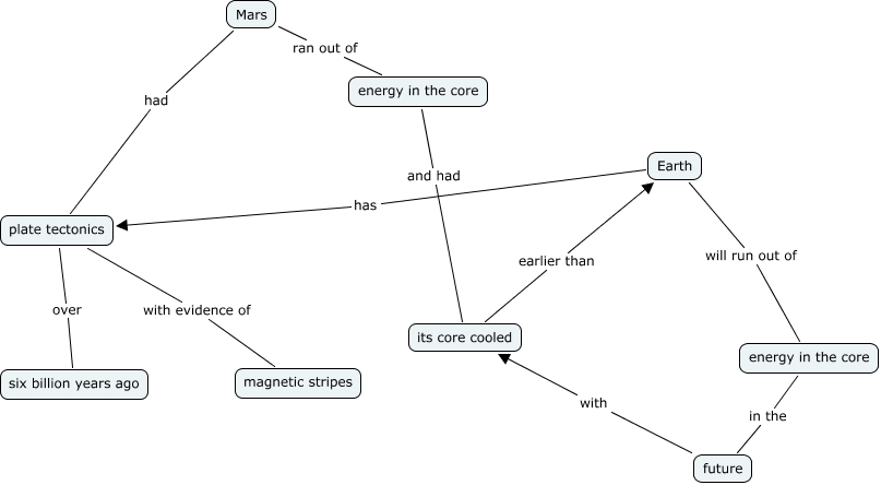 This Concept Map, created with IHMC CmapTools, has information related to: Mars, plate tectonics over six billion years ago, Earth has plate tectonics, plate tectonics with evidence of magnetic stripes, Earth will run out of energy in the core, Mars had plate tectonics, Mars ran out of energy in the core, its core cooled earlier than Earth, energy in the core and had its core cooled, future with its core cooled, energy in the core in the future