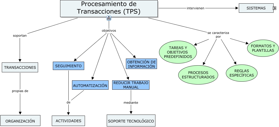 Este Cmap, tiene información relacionada con: TPS, Procesamiento de Transacciones (TPS) intervienen SISTEMAS, Procesamiento de Transacciones (TPS) soportan TRANSACCIONES, AUTOMATIZACIÓN de ACTIVIDADES, Procesamiento de Transacciones (TPS) objetivos OBTENCIÓN DE INFORMACIÓN, Procesamiento de Transacciones (TPS) se caracteriza por FORMATOS Y PLANTILLAS, TRANSACCIONES propias de ORGANIZACIÓN, SEGUIMIENTO de ACTIVIDADES, Procesamiento de Transacciones (TPS) objetivos REDUCIR TRABAJO MANUAL, Procesamiento de Transacciones (TPS) se caracteriza por PROCESOS ESTRUCTURADOS, Procesamiento de Transacciones (TPS) objetivos SEGUIMIENTO, Procesamiento de Transacciones (TPS) se caracteriza por REGLAS ESPECÍFICAS, Procesamiento de Transacciones (TPS) objetivos AUTOMATIZACIÓN, Procesamiento de Transacciones (TPS) se caracteriza por TAREAS Y OBJETIVOS PREDEFINIDOS, REDUCIR TRABAJO MANUAL mediante SOPORTE TECNOLÓGICO