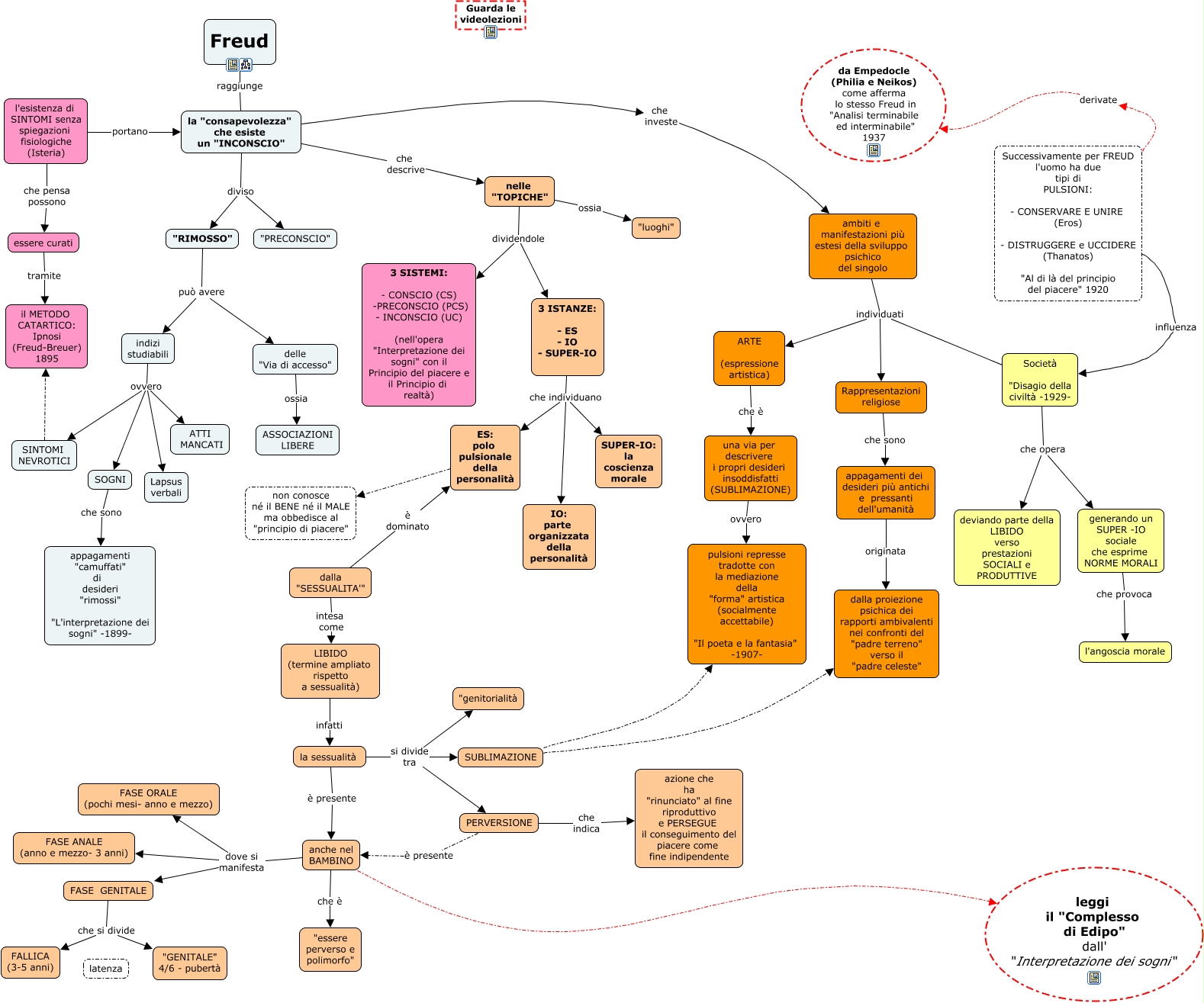 Questa Cmap, creata con IHMC CmapTools, contiene informazioni relative a: Freud, dalla "SESSUALITA'" è dominato ES: polo pulsionale della personalità, SOGNI che sono appagamenti "camuffati" di desideri "rimossi" "L'interpretazione dei sogni" -1899-, la sessualità si divide tra PERVERSIONE, la "consapevolezza" che esiste un "INCONSCIO" che investe ambiti e manifestazioni più estesi della sviluppo psichico del singolo, Successivamente per FREUD l'uomo ha due tipi di PULSIONI: - CONSERVARE E UNIRE (Eros) - DISTRUGGERE e UCCIDERE (Thanatos) "Al di là del principio del piacere" 1920 influenza Società "Disagio della civiltà -1929-, indizi studiabili ovvero SOGNI, generando un SUPER -IO sociale che esprime NORME MORALI che provoca l'angoscia morale, FASE GENITALE che si divide FALLICA (3-5 anni), Società "Disagio della civiltà -1929- che opera deviando parte della LIBIDO verso prestazioni SOCIALI e PRODUTTIVE, la sessualità si divide tra "genitorialità, l'esistenza di SINTOMI senza spiegazioni fisiologiche (Isteria) portano la "consapevolezza" che esiste un "INCONSCIO", essere curati tramite il METODO CATARTICO: Ipnosi (Freud-Breuer) 1895, PERVERSIONE che indica azione che ha "rinunciato" al fine riproduttivo e PERSEGUE il conseguimento del piacere come fine indipendente, appagamenti dei desideri più antichi e pressanti dell'umanità originata dalla proiezione psichica dei rapporti ambivalenti nei confronti del "padre terreno" verso il "padre celeste", LIBIDO (termine ampliato rispetto a sessualità) infatti la sessualità, Successivamente per FREUD l'uomo ha due tipi di PULSIONI: - CONSERVARE E UNIRE (Eros) - DISTRUGGERE e UCCIDERE (Thanatos) "Al di là del principio del piacere" 1920 derivate da Empedocle (Philia e Neikos) come afferma lo stesso Freud in "Analisi terminabile ed interminabile" 1937, la sessualità si divide tra SUBLIMAZIONE, anche nel BAMBINO dove si manifesta FASE ORALE (pochi mesi- anno e mezzo), 3 ISTANZE: - ES - IO - SUPER-IO che individuano ES: polo pulsionale della personalità, la "consapevolezza" che esiste un "INCONSCIO" diviso "PRECONSCIO"