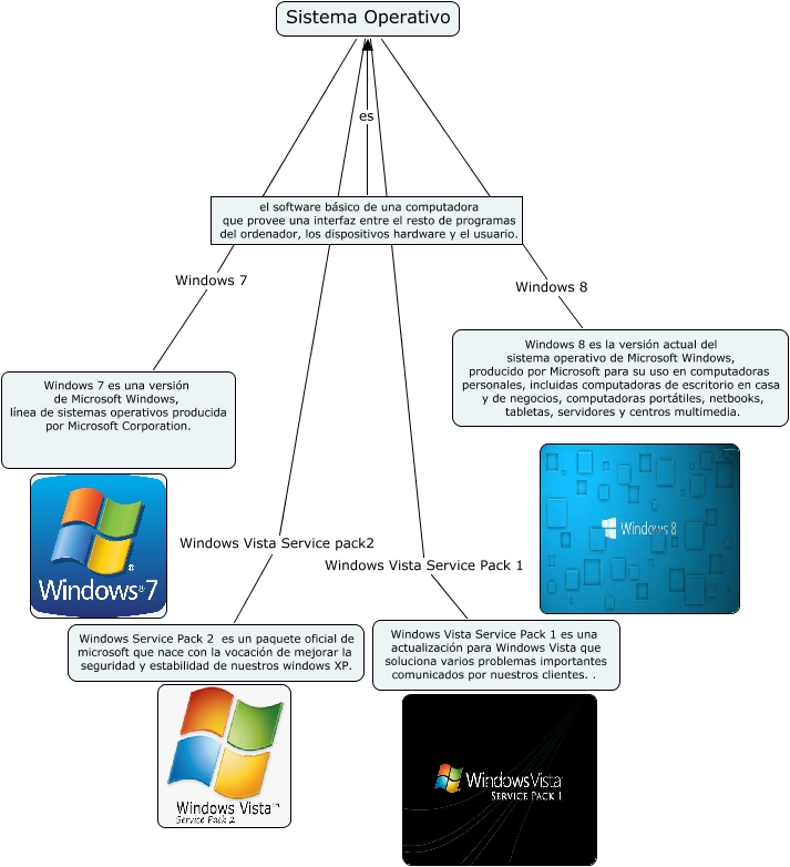 Este Cmap, tiene información relacionada con: Sin Título 1, el software básico de una computadora que provee una interfaz entre el resto de programas del ordenador, los dispositivos hardware y el usuario. es Sistema Operativo, Sistema Operativo Windows 7 Windows 7 es una versión de Microsoft Windows, línea de sistemas operativos producida por Microsoft Corporation., Sistema Operativo Windows 8 Windows 8 es la versión actual del sistema operativo de Microsoft Windows, producido por Microsoft para su uso en computadoras personales, incluidas computadoras de escritorio en casa y de negocios, computadoras portátiles, netbooks, tabletas, servidores y centros multimedia., Sistema Operativo Windows Vista Service pack2 Windows Service Pack 2 es un paquete oficial de microsoft que nace con la vocación de mejorar la seguridad y estabilidad de nuestros windows XP., Sistema Operativo Windows Vista Service Pack 1 Windows Vista Service Pack 1 es una actualización para Windows Vista que soluciona varios problemas importantes comunicados por nuestros clientes. .
