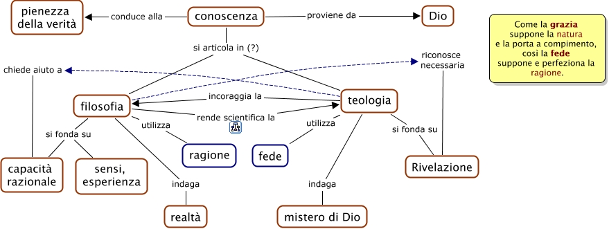 Questa Cmap, creata con IHMC CmapTools, contiene informazioni relative a: 03 Filosofia e fede, conoscenza si articola in (?) teologia, filosofia si fonda su capacità razionale, filosofia rende scientifica la teologia, teologia incoraggia la filosofia, filosofia si fonda su sensi, esperienza, conoscenza conduce alla pienezza della verità, conoscenza si articola in (?) filosofia, filosofia indaga realtà, teologia si fonda su Rivelazione, conoscenza proviene da Dio, teologia chiede aiuto a capacità razionale, teologia utilizza fede, filosofia utilizza ragione, teologia indaga mistero di Dio, filosofia riconosce necessaria Rivelazione