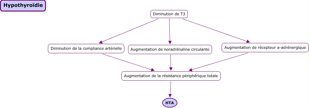 Cette carte de concepts créée avec IHMC CmapTools traite de: hypothyroïdie, Augmentation de noradrénaline circulante Augmentation de la résistance périphérique totale, Augmentation de la résistance périphérique totale HTA, Diminution de T3 Augmentation de récepteur a-adrénergique, Diminution de la compliance artérielle Augmentation de la résistance périphérique totale, Diminution de T3 Augmentation de noradrénaline circulante, Augmentation de récepteur a-adrénergique Augmentation de la résistance périphérique totale, Diminution de T3 Diminution de la compliance artérielle