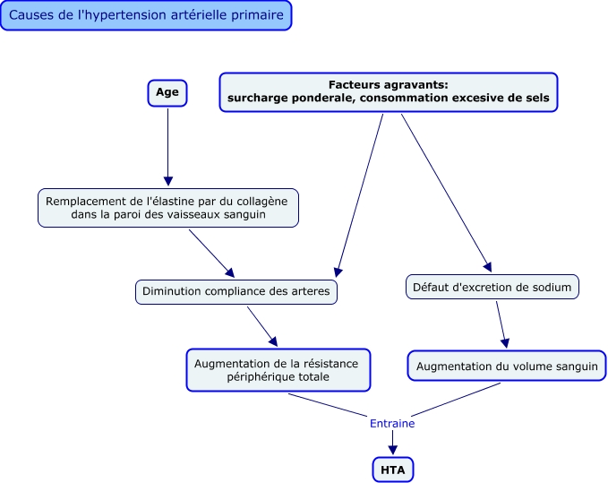 Cette carte de concepts créée avec IHMC CmapTools traite de: HTA essentielle, Défaut d'excretion de sodium Augmentation du volume sanguin, Age Remplacement de l'élastine par du collagène dans la paroi des vaisseaux sanguin, Diminution compliance des arteres Augmentation de la résistance périphérique totale, Remplacement de l'élastine par du collagène dans la paroi des vaisseaux sanguin Diminution compliance des arteres, Facteurs agravants: surcharge ponderale, consommation excesive de sels Défaut d'excretion de sodium, Augmentation de la résistance périphérique totale Entraine HTA, Augmentation du volume sanguin Entraine HTA, Facteurs agravants: surcharge ponderale, consommation excesive de sels Diminution compliance des arteres