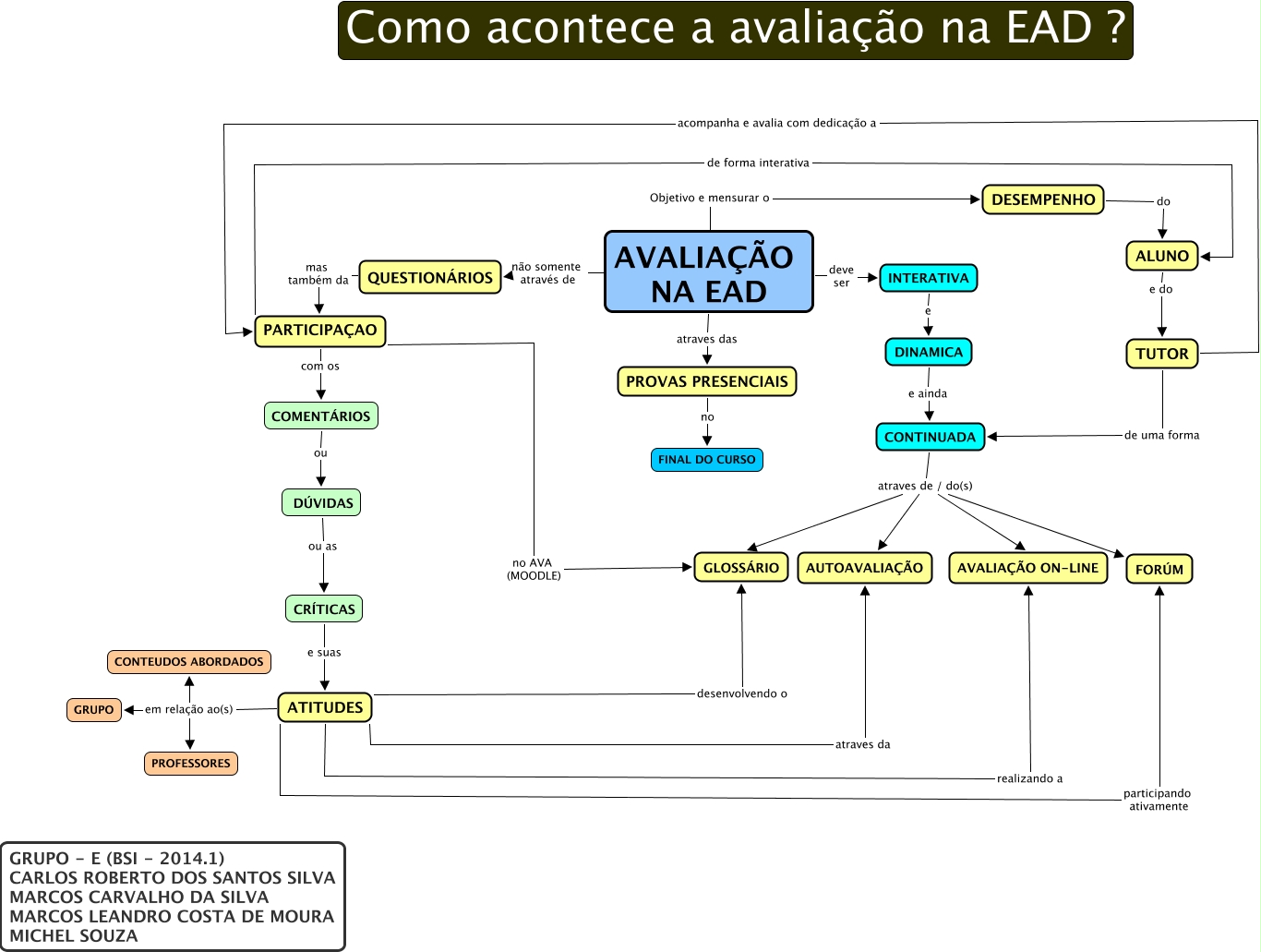 Esse mapa conceitual, produzido no IHMC CmapTools, tem a informação relacionada a: 1 SEM - 4a semana - atividade - mapa conceitual da avaliacao na EAD, ATITUDES em relação ao(s) GRUPO, ATITUDES em relação ao(s) CONTEUDOS ABORDADOS, PARTICIPAÇAO de forma interativa ALUNO, CONTINUADA atraves de / do(s) FORÚM, TUTOR de uma forma CONTINUADA, ATITUDES realizando a AVALIAÇÃO ON-LINE, PARTICIPAÇAO com os COMENTÁRIOS, ALUNO e do TUTOR, ATITUDES atraves da AUTOAVALIAÇÃO, AVALIAÇÃO NA EAD atraves das PROVAS PRESENCIAIS, COMENTÁRIOS ou DÚVIDAS, CONTINUADA atraves de / do(s) GLOSSÁRIO, PROVAS PRESENCIAIS no FINAL DO CURSO, DESEMPENHO do ALUNO, AVALIAÇÃO NA EAD deve ser INTERATIVA, CONTINUADA atraves de / do(s) AVALIAÇÃO ON-LINE, ATITUDES desenvolvendo o GLOSSÁRIO, INTERATIVA e DINAMICA, AVALIAÇÃO NA EAD Objetivo e mensurar o DESEMPENHO, AVALIAÇÃO NA EAD não somente através de QUESTIONÁRIOS