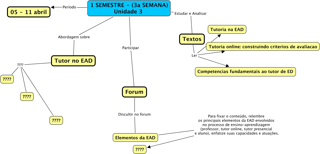 Esse mapa conceitual, produzido no IHMC CmapTools, tem a informação relacionada a: 1 SEM - 3a semana, 1 SEMESTRE - (3a SEMANA) Unidade 3 Período 05 - 11 abril, 1 SEMESTRE - (3a SEMANA) Unidade 3 Estudar e Analisar Textos, Textos Ler Competencias fundamentais ao tutor de ED, Tutor no EAD ???? ????, Tutor no EAD ???? ????, Textos Ler Tutoria na EAD, 1 SEMESTRE - (3a SEMANA) Unidade 3 Participar Forum, Textos Ler Tutoria online: construindo criterios de avaliacao, 1 SEMESTRE - (3a SEMANA) Unidade 3 Abordagem sobre Tutor no EAD, Tutor no EAD ???? ????, Forum Discultir no forum Elementos da EAD, Elementos da EAD Para fixar o conteúdo, relembre os principais elementos da EAD envolvidos no processo de ensino-aprendizagem (professor, tutor online, tutor presencial e aluno), enfatize suas capacidades e atuações. ????