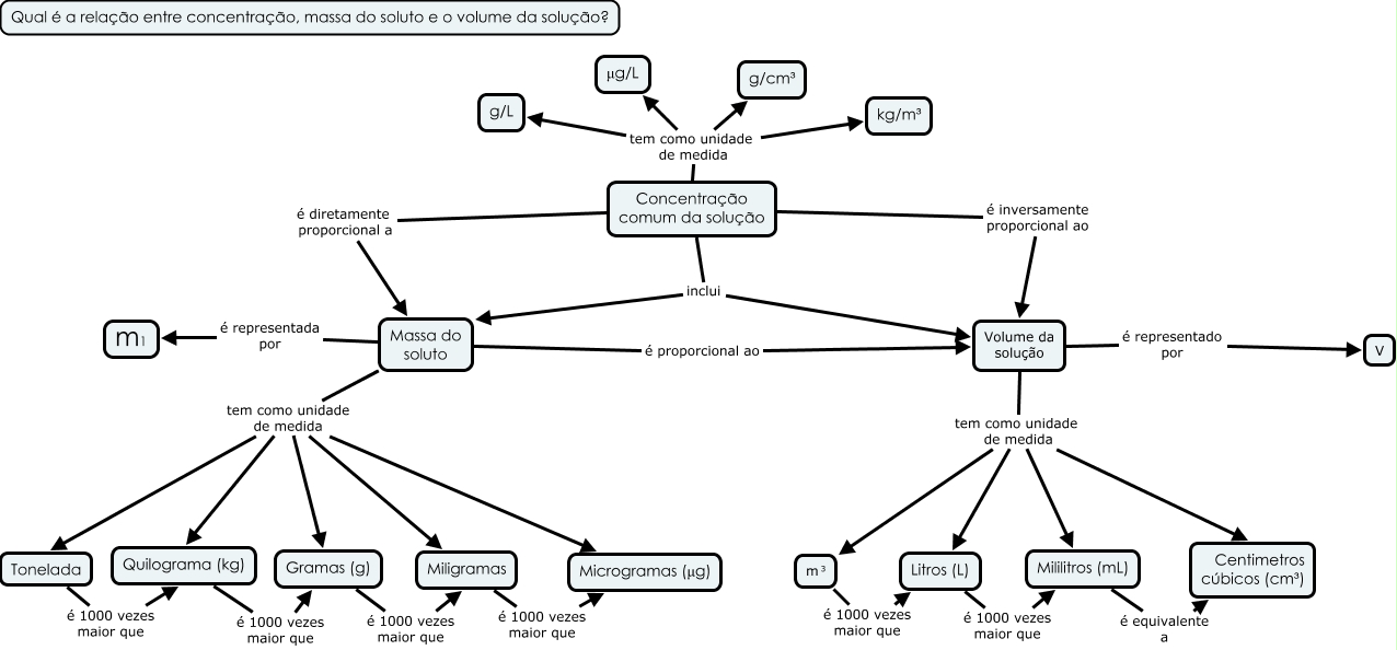 Esse mapa conceitual, produzido no IHMC CmapTools, tem a informação relacionada a: Concentração comum 2A, <math xmlns="http://www.w3.org/1998/Math/MathML"> <mrow> <mmultiscripts> <mtext> m </mtext> <none/> <mtext> 3 </mtext> </mmultiscripts> </mrow> </math> é 1000 vezes maior que Litros (L), Volume da solução tem como unidade de medida Mililitros (mL), Volume da solução é representado por V, Tonelada é 1000 vezes maior que Quilograma (kg), Massa do soluto tem como unidade de medida Microgramas (μg), Massa do soluto tem como unidade de medida Tonelada, Massa do soluto tem como unidade de medida Quilograma (kg), Volume da solução tem como unidade de medida <math xmlns="http://www.w3.org/1998/Math/MathML"> <mrow> <mmultiscripts> <mtext> m </mtext> <none/> <mtext> 3 </mtext> </mmultiscripts> </mrow> </math>, Quilograma (kg) é 1000 vezes maior que Gramas (g), Massa do soluto tem como unidade de medida Miligramas, Concentração comum da solução tem como unidade de medida μg/L, Volume da solução tem como unidade de medida Litros (L), Concentração comum da solução inclui Volume da solução, Concentração comum da solução tem como unidade de medida g/L, Gramas (g) é 1000 vezes maior que Miligramas, Massa do soluto é proporcional ao Volume da solução, Litros (L) é 1000 vezes maior que Mililitros (mL), Massa do soluto é representada por m1, Concentração comum da solução inclui Massa do soluto, Massa do soluto tem como unidade de medida Gramas (g)