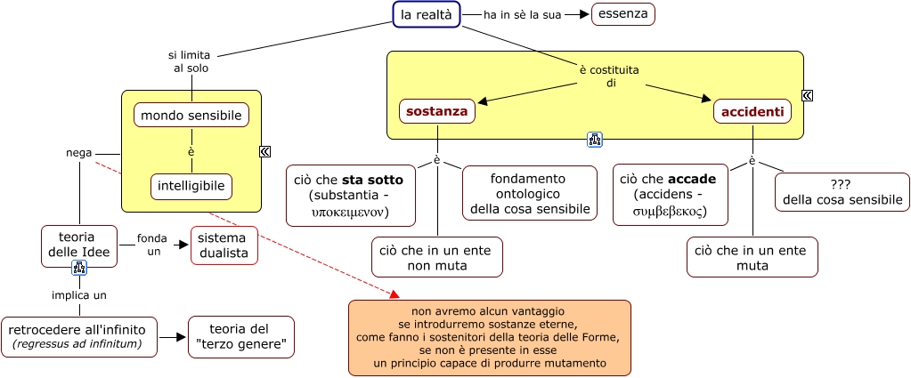 Questa Cmap, creata con IHMC CmapTools, contiene informazioni relative a: 09h Aristotele - Sostanza e accidenti - Critica a Platone, accidenti è ciò che accade (accidens - συμβεβεκος), sostanza è ciò che sta sotto (substantia - υποκειμενον), la realtà è costituita di accidenti, retrocedere all'infinito (regressus ad infinitum) teoria del "terzo genere", mondo sensibile è intelligibile, sostanza è fondamento ontologico della cosa sensibile, teoria delle Idee implica un retrocedere all'infinito (regressus ad infinitum), la realtà è costituita di sostanza, accidenti è ciò che in un ente muta, la realtà si limita al solo mondo sensibile, teoria delle Idee fonda un sistema dualista, la realtà ha in sè la sua essenza, accidenti è ??? della cosa sensibile, sostanza è ciò che in un ente non muta, ???? nega non avremo alcun vantaggio se introdurremo sostanze eterne, come fanno i sostenitori della teoria delle Forme, se non è presente in esse un principio capace di produrre mutamento, ???? nega teoria delle Idee