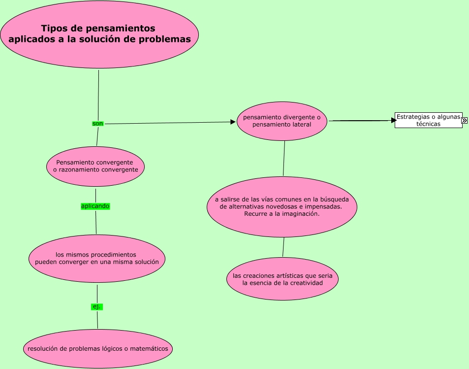 Este Cmap, tiene información relacionada con: 04, los mismos procedimientos pueden converger en una misma solución ej. resolución de problemas lógicos o matemáticos, pensamiento divergente o pensamiento lateral Revisión de supuestos, pensamiento divergente o pensamiento lateral Inversión, pensamiento divergente o pensamiento lateral Estimulo al azar, pensamiento divergente o pensamiento lateral Búsqueda de alternativas, Tipos de pensamientos aplicados a la solución de problemas son Pensamiento convergente o razonamiento convergente, pensamiento divergente o pensamiento lateral tiende a salirse de las vías comunes en la búsqueda de alternativas novedosas e impensadas. Recurre a la imaginación., Pensamiento convergente o razonamiento convergente aplicando los mismos procedimientos pueden converger en una misma solución, Tipos de pensamientos aplicados a la solución de problemas son pensamiento divergente o pensamiento lateral, a salirse de las vías comunes en la búsqueda de alternativas novedosas e impensadas. Recurre a la imaginación. ej. las creaciones artísticas que seria la esencia de la creatividad, pensamiento divergente o pensamiento lateral Selección del punto de entrada de la mente y área de atención, pensamiento divergente o pensamiento lateral Fraccionamiento o división, pensamiento divergente o pensamiento lateral Aplazamiento de juicio