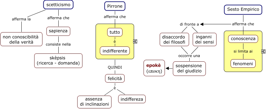Questa Cmap, creata con IHMC CmapTools, contiene informazioni relative a: 10h Scuola scettica, scetticismo afferma la non conoscibilità della verità, ???? QUINDI felicità, tutto è indifferente, disaccordo dei filosofi occorre una sospensione del giudizio, scetticismo afferma che sapienza, Sesto Empirico afferma che di fronte a disaccordo dei filosofi, sapienza consiste nella skèpsis (ricerca - domanda), felicità è indiffereza, Pirrone afferma che tutto, conoscenza si limita ai fenomeni, Sesto Empirico afferma che di fronte a inganni dei sensi, inganni dei sensi occorre una sospensione del giudizio, Sesto Empirico afferma che conoscenza, felicità è assenza di inclinazioni, sospensione del giudizio epokè (εποκη)