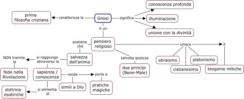 Questa Cmap, creata con IHMC CmapTools, contiene informazioni relative a: 11d La Gnosi, salvezza dell'anima si raggiunge attraverso la sapienza / conoscenza, pensiero religioso unisce a teogonie mitiche, pensiero religioso talvolta ipotizza due princìpi (Bene-Male), pensiero religioso unisce cistianesimo, Gnosi significa unione con la divinità, sapienza / conoscenza rende simili a Dio, sapienza / conoscenza si alimenta di dottrine esotiriche, salvezza dell'anima si raggiunge attraverso la NON tramite la fede nella Rivelazione, Gnosi caratterizza la prima filosofia cristiana, pensiero religioso unisce ebraismo, Gnosi significa illuminazione, Gnosi significa conoscenza profonda, Gnosi è un pensiero religioso, pensiero religioso unisce platonismo, pensiero religioso sostiene che salvezza dell'anima, sapienza / conoscenza rende porta a pratiche magiche