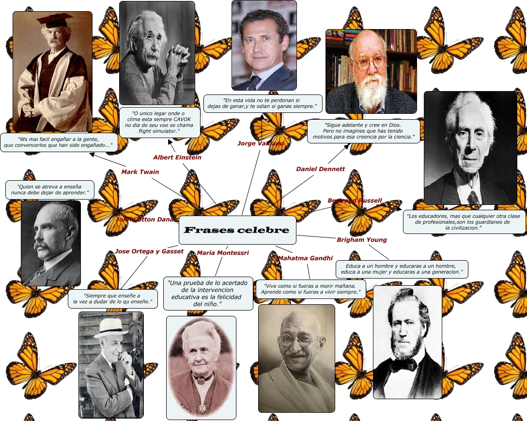 Este Cmap, tiene información relacionada con: frases celebre, Frases celebre Maria Montessri "Una prueba de lo acertado de la intervencion educativa es la felicidad del niño.", Frases celebre Albert Einstein "O unico legar onde o clima esta sempre CAVOK no dia do seu voo se chama flight simulator.", Frases celebre Daniel Dennett "Sigue adelante y cree en Dios. Pero no imagines que has tenido motivos para esa creencia por la ciencia.", Frases celebre Mark Twain "Ws mai facil engañar a la gente, que convencerlos que han sido engañado...", Frases celebre Jorge Valdano "En esta vida no te perdonan si dejas de ganar,y te odian si ganas siempre.", Frases celebre John Cotton Dana "Quien se atreva a enseña nunca debe dejar de aprender.", Frases celebre Mahatma Gandhi "Vive como si fueras a morir mañana. Aprende como si fueras a vivir siempre.", Frases celebre Brigham Young Educa a un hombre y educaras a un hombre, educa a una mujer y educaras a una generacion.", Frases celebre Bertrand Russell "Los educadores, mas que cualquier otra clase de profesionales,son los guardianes de la civilizacion.", Frases celebre Jose Ortega y Gasset "Siempre que enseñe a la vez a dudar de lo qu enseñe."